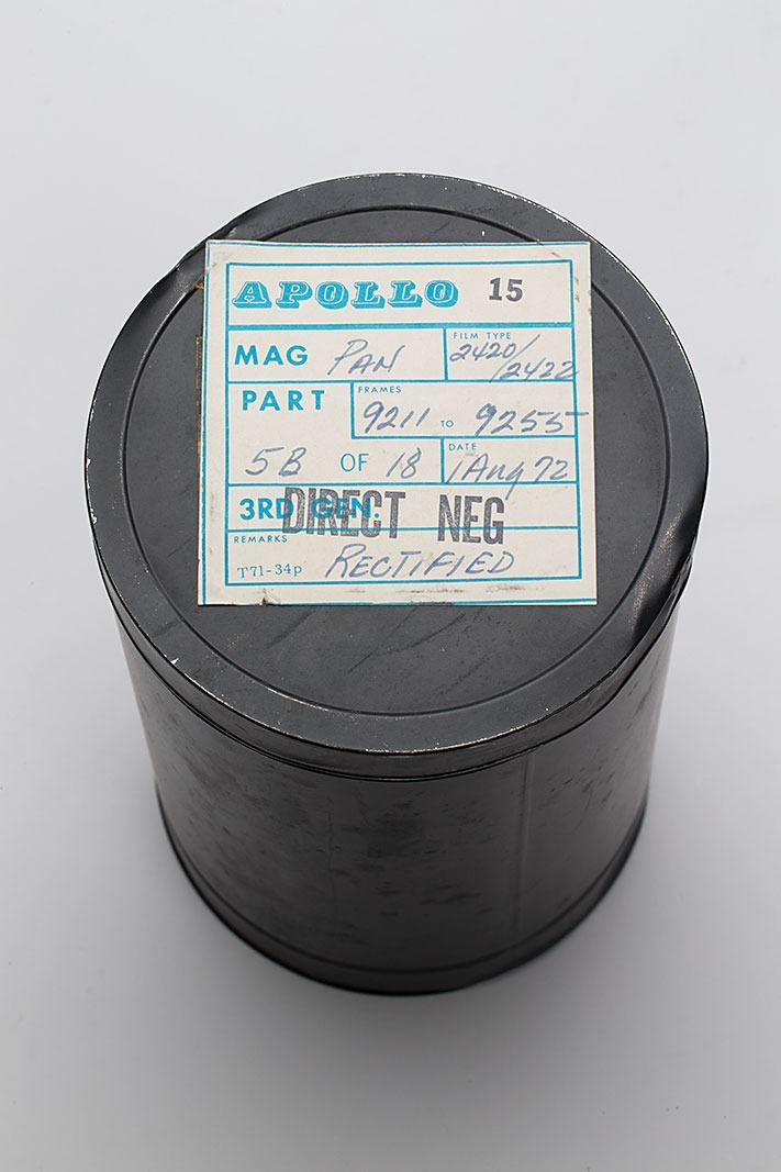 Roll of direct negatives of the lunar surface taken by the panoramic camera in the Scientific Instrument Module (SIM) Bay of the Apollo 15 CSM, in its original canister measuring 10.25? tall and 6.25? in diameter. The label on the top reads: "Apollo 15, Mag Pan, Film type: 2420/2422, Part 5B of 18, Frames 9211 to 9255, Date 1 Aug 72, Direct Neg, Rectified." The roll features 45 panoramic frames of film, each measuring approximately four feet long by nine inches wide. In fine condition, with dents to the canister's rim. This film was directly reproduced from the original negatives taken in space by the 24-inch-focal-length Itek camera carried in the CSM SIM Bay, which were retrieved by Al Worden during an EVA prior to reentry. These high-resolution lunar panoramas were used in improving NASA's lunar maps.