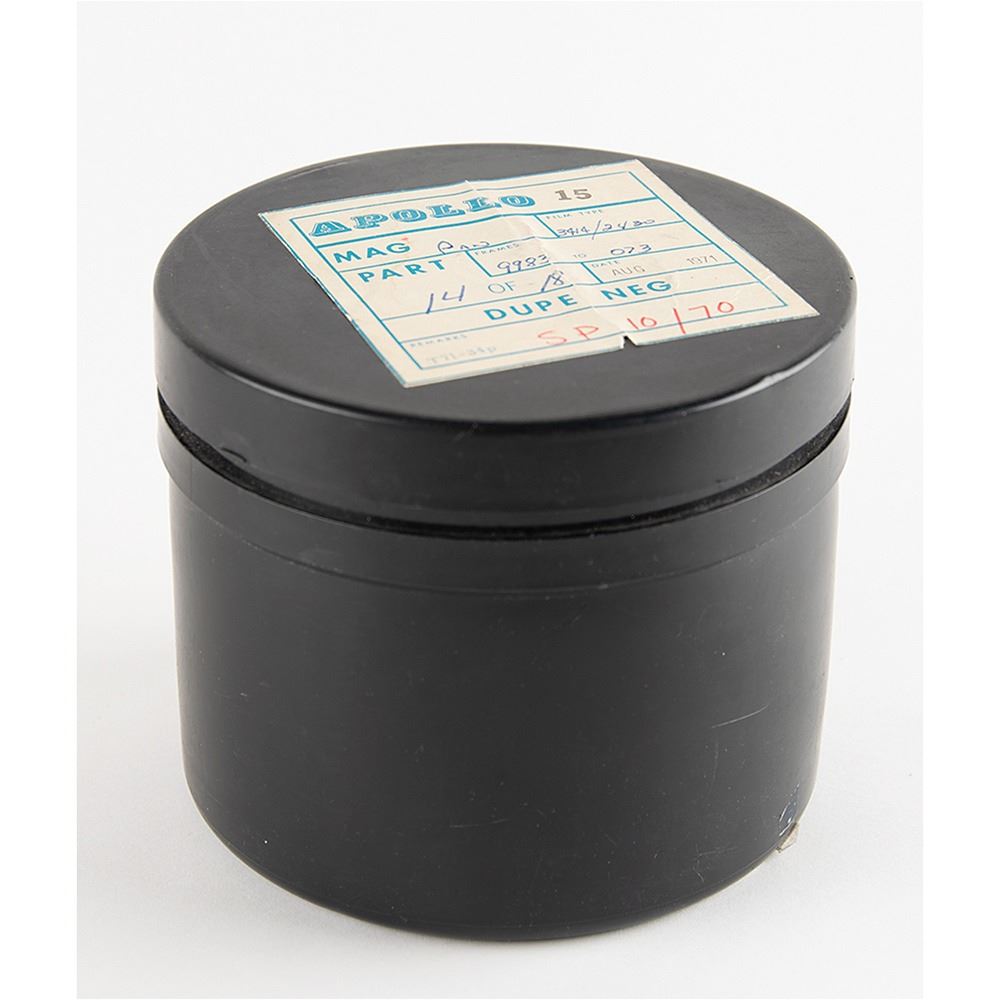 Roll of duplicate negatives of the lunar surface taken by the panoramic camera in the Scientific Instrument Module (SIM) Bay of the Apollo 15 CSM, in its original canister measuring 5.5è tall and 6.5è in diameter. The label on the top reads: "Apollo 15, Mag Pan, Film type: 3414/2430, Part 14 of 18, Date Aug 1971, Dupe Neg, Remarks, T71-34p SP 10/70.‰Û In fine condition, with some scuffs to canister and wear to the lid label. This film was directly reproduced from the original negatives taken in space by the 24-inch-focal-length Itek camera carried in the CSM SIM Bay, which was retrieved by Al Worden during an EVA prior to reentry. These high-resolution lunar panoramas were used in improving NASA's lunar maps.