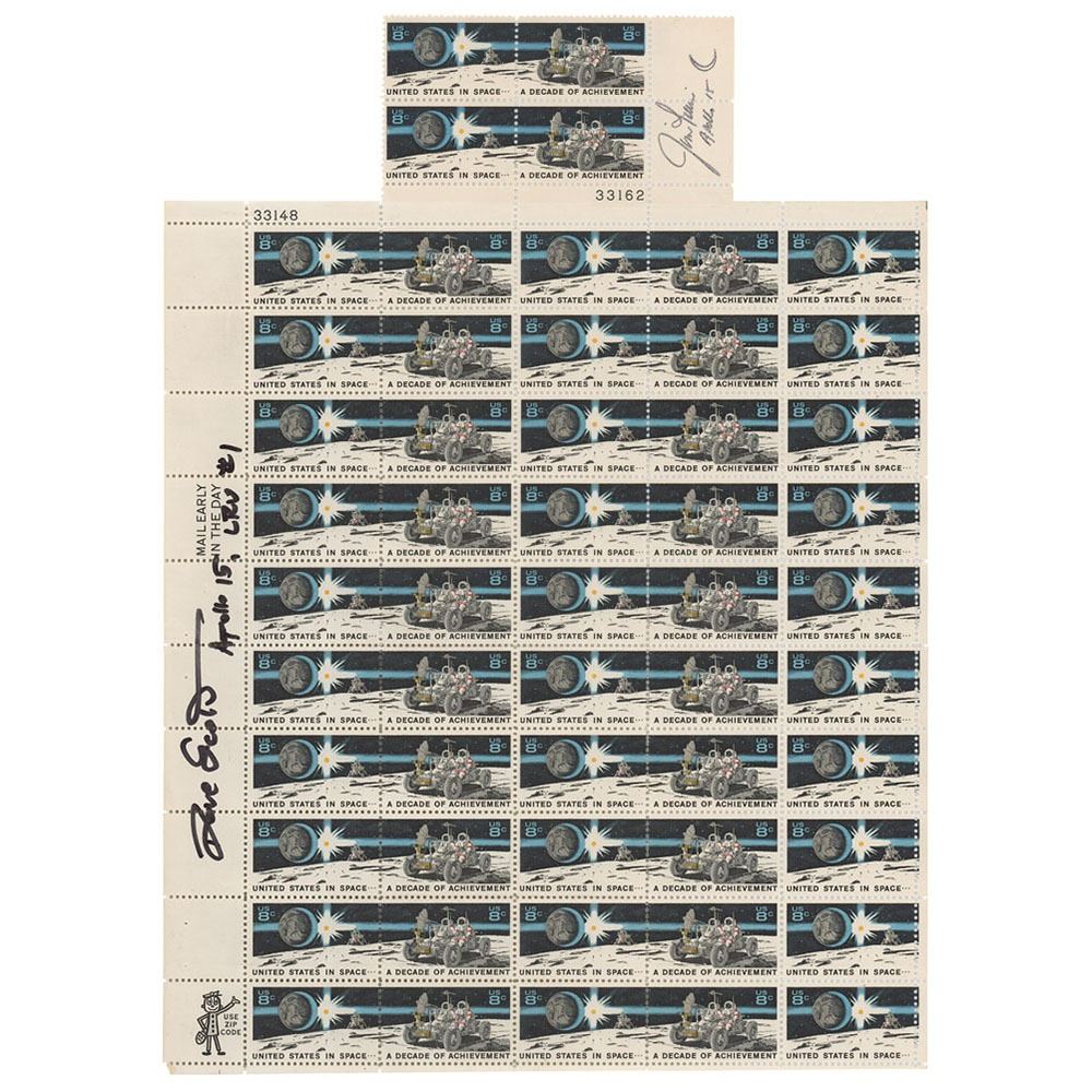 Two blocks of eight cent ‰Û÷United States in Space, a Decade of Achievement‰Ûª stamps individually signed by the Apollo 15 moonwalkers: a block of 50 stamps signed vertically in the left margin in black felt tip, ‰ÛÏDave Scott, Apollo 15, LRV #1‰Û; and a block of four stamps, signed vertically in the right margin in black ink, ‰ÛÏJim Irwin, Apollo 15,‰Û with crescent moon sketch. In overall fine condition. Accompanied by three sets of ‰Û÷Decade of Achievement‰Ûª error stamps.