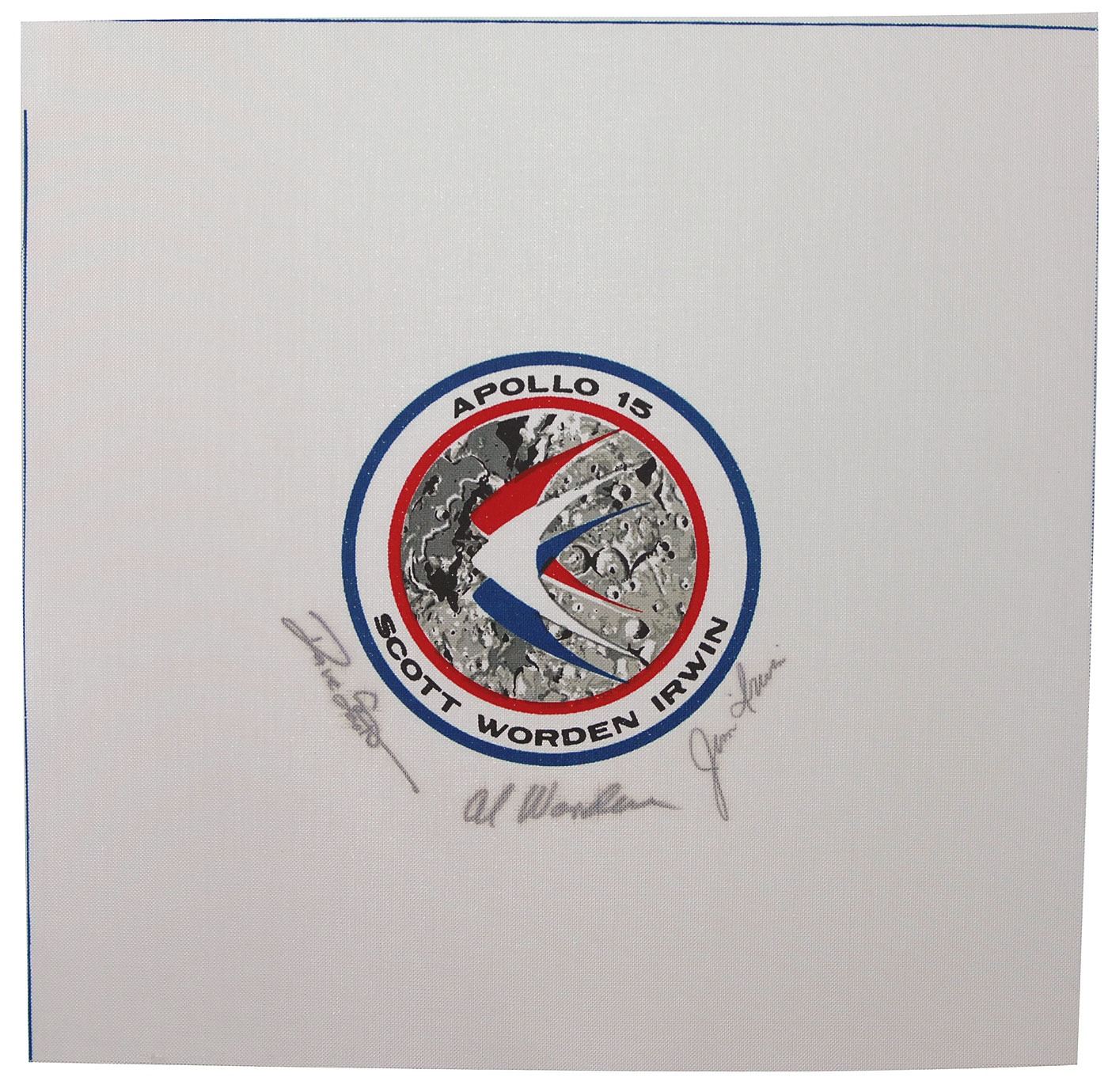 A 9 x 9 swatch of Beta cloth, bearing a color 3.25? diameter Apollo 15 mission emblem, signed in black felt tip by Dave Scott, Al Worden, and Jim Irwin. In fine condition, with all signatures a shade or two light, but well contrasted against the white background.