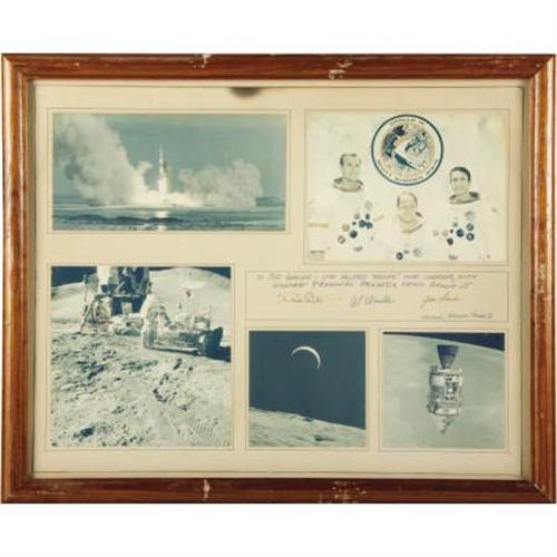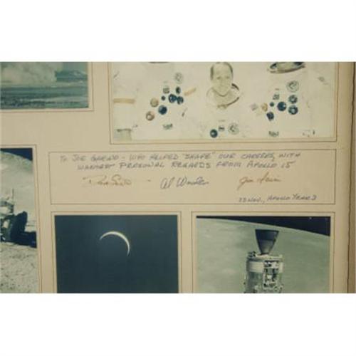 <B>Apollo 15 Signed Color Photograph Montage.</B></I> Five color photographs of the mission are affixed on a 19" x 15" mat upon which Al Worden has handwritten a note in a 10.25" x 1.75" rectangular area beneath a crew photograph: "<I>To Joe Garino - who helped 'shape' our careers with/ warmest personal regards from Apollo 15/ Al Worden/ 23 Nov., Apollo Year 3,</B></I>" also signed "<I>Dave Scott</B></I>" and "<I>Jim Irwin.</B></I>" The photos have faded lightly and the mat is stained at the top edge, not affecting the signatures or photos. Scott and Irwin walked on the moon. Framed to 21.5" x 17.5". <I>From the collection of renowned former physical trainer of the astronauts Joe Garino. This lot is accompanied by a signed certificate of authentication from Garino verifying its provenance.</B></I><BR><BR><b>Shipping:</b> Framed - with Glass, Medium (<a target="_blank" href="http://www.heritageauctions.com/common/shipping.php">view shipping information</a>)