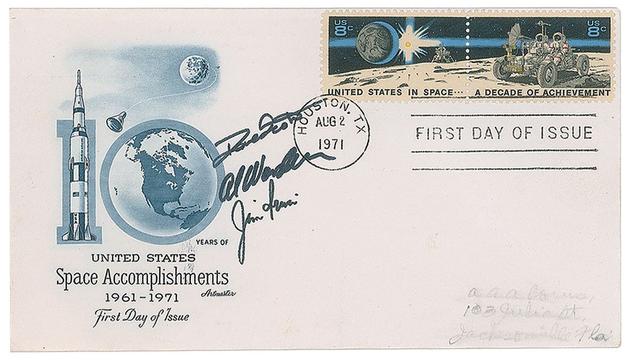 FDC with a cachet honoring a decade of United States Space Accomplishments, postmarked on August 2, 1971, the date of the return launch of the Lunar Module Falcon, signed in black felt tip by the Apollo 15 crew—Dave Scott, Al Worden, and Jim Irwin. In fine condition, with an erased address to the lower right corner.