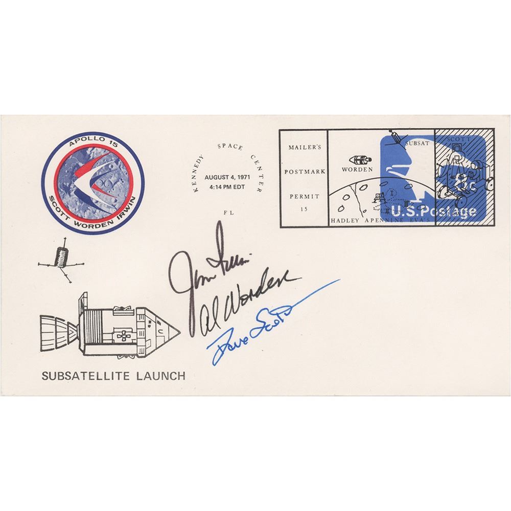 Commemorative cover with a color cachet honoring the launch of the Particles and Fields Subsatellite (PFS-1) during the Apollo 15 mission, signed in blue or black felt tip by Jim Irwin, Al Worden, and Dave Scott. In very fine condition.