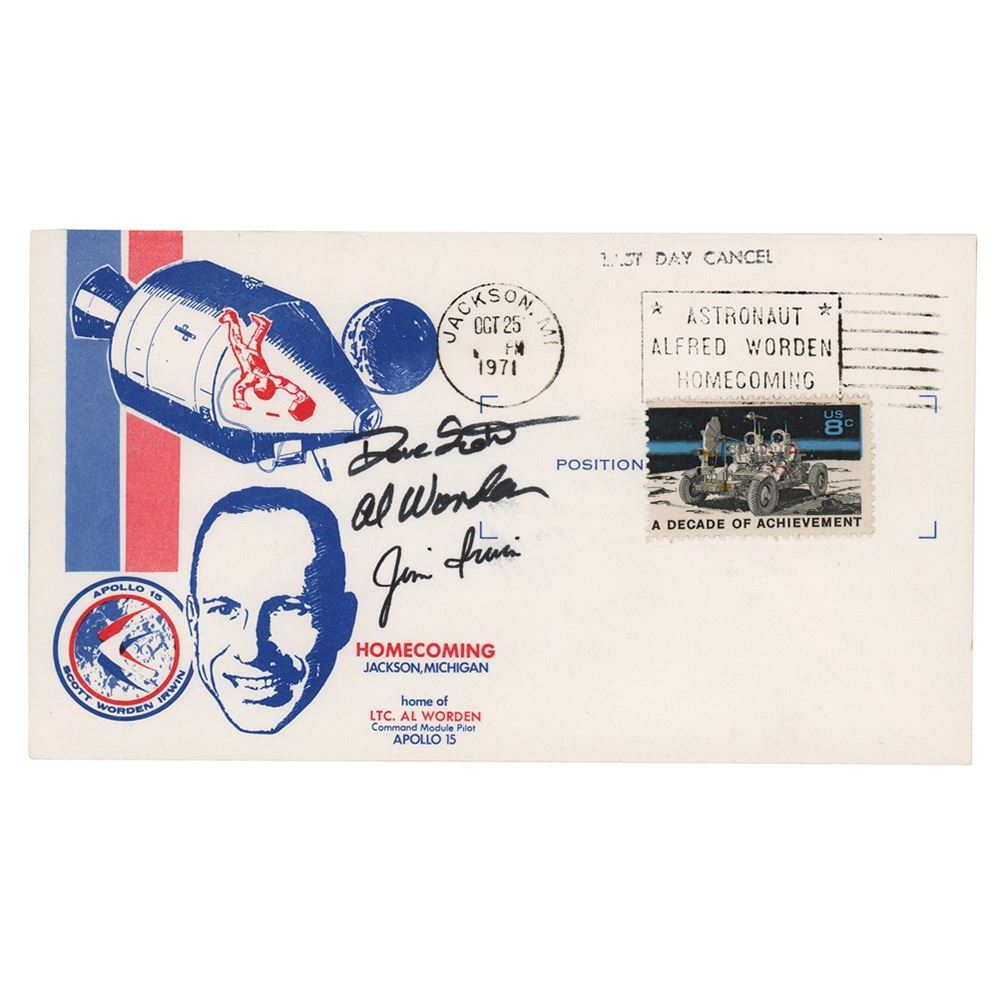 Appealing commemorative cover with a cachet and stamps honoring the homecoming of Apollo 15 astronaut Al Worden, postmarked at Jackson, Michigan, on October 25, 1971, signed in black felt tip by Dave Scott, Al Worden, and Jim Irwin. In very fine condition. Worden was born and raised in Jackson, Michigan, graduating from Jackson High School in 1950.