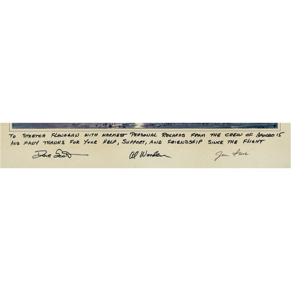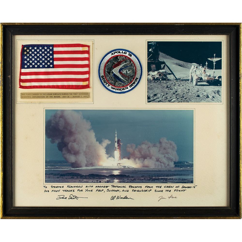Sought-after flown American flag, 6.25 x 4, carried to the moon aboard the Lunar Module Falcon during the historic Apollo 15 mission. The flag is mounted with an embroidered patch and two color photos of the mission launch and a lunar EVA, with the lower border of the mount signed in black felt tip by astronauts Dave Scott, Jim Irwin, and Al Worden, with the latter adding an inscription: “To Stretch Flanagan with warmest personal regards from the crew of Apollo 15 and many thanks for your help, support, and friendship since the flight.” Framed to an overall size of 21.5 x 17.5. In fine condition, with adhesive toning to reverse of flag.