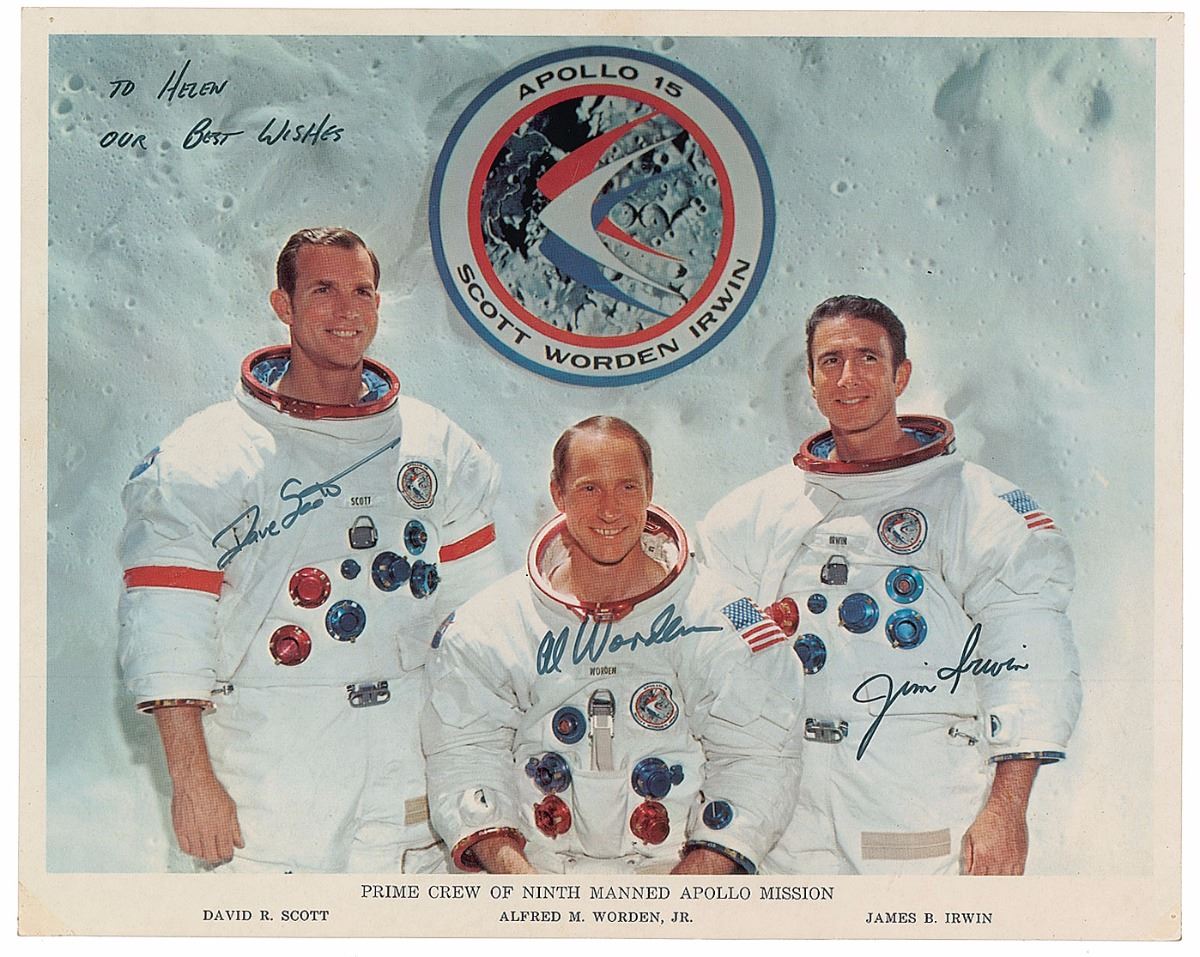 Official color 10 x 8 NASA lithograph of the Apollo 15 crew posing in their white spacesuits against a lunar backdrop, signed and inscribed in black felt tip, “To Helen, Our best wishes, Jim Irwin,” “Dave Scott,” and “Al Worden.” In fine condition, with pin holes to three corners. A very nice example of the fourth crew to land on the moon.