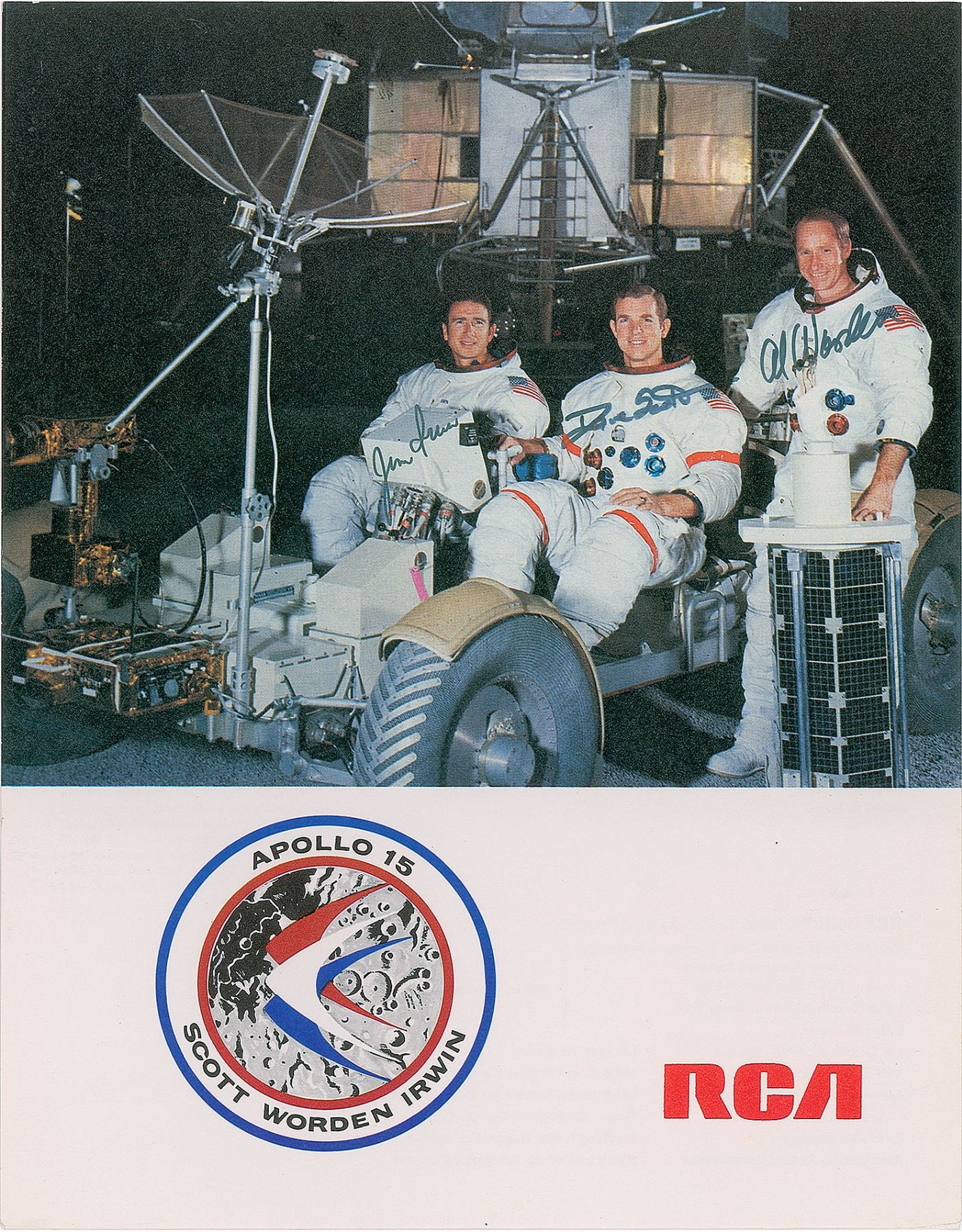 Uncommon color 8.5 x 11 RCA promotional paperstock photo of the Apollo 15 crew posing in their white space suits with the lunar cover, signed in black felt tip by Jim Irwin, Dave Scott, and Al Worden. Reverse bears information text relating to the fourth Apollo mission to land on the moon. In fine condition.