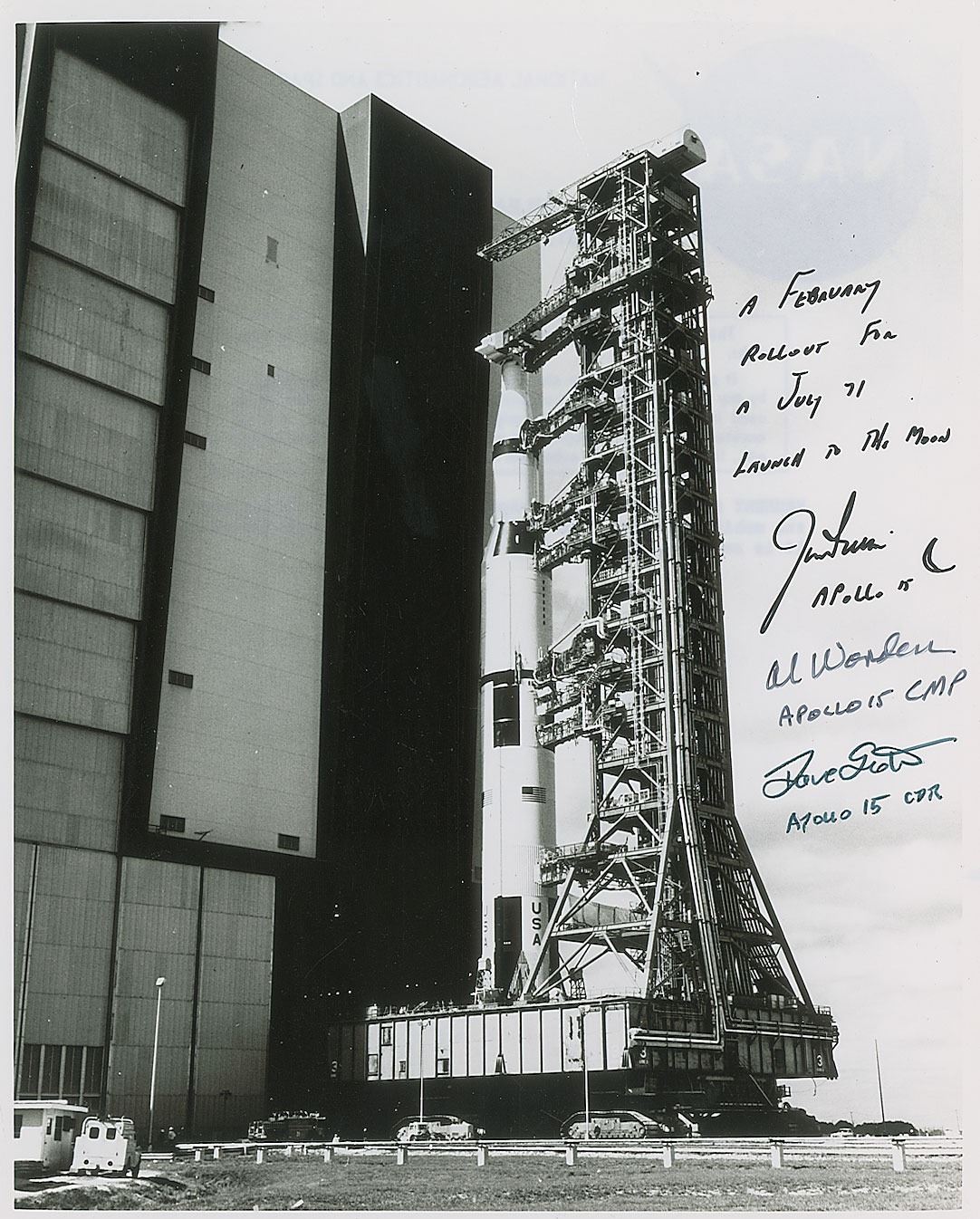 Official glossy 8 x 10 NASA photo of the Apollo 15 Saturn V being moved from High Bay 1 to High Bay 3 of the Vehicle Assembly Building (VAB) to stack the launch escape system on February 2, 1971, signed in black felt tip, "A February rollout for a July 71 launch to the moon, Jim Irwin, Apollo 15," "Al Worden, Apollo 15 CMP," and "Dave Scott, Apollo 15 CDR." Reverse bears purple NASA caption text. In very good to fine condition, with a small crease to the top of the tower, and light show-through from the meatball logo on the reverse.