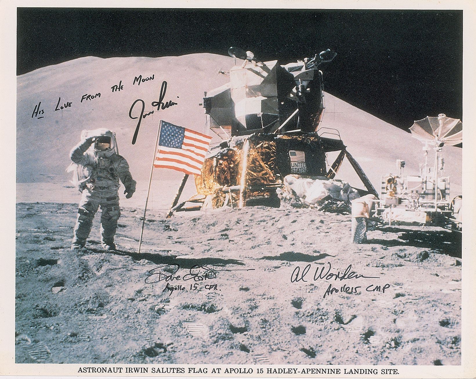Official color 10 x 8 NASA lithograph of LMP Jim Irwin saluting the American flag on the lunar surface, signed in thin black felt tip, "Dave Scott, Apollo 15 CDR," "Al Worden, Apollo 15, CMP," and "Jim Irwin," with a preprinted "His Love from the Moon" sentiment above. In very fine condition.