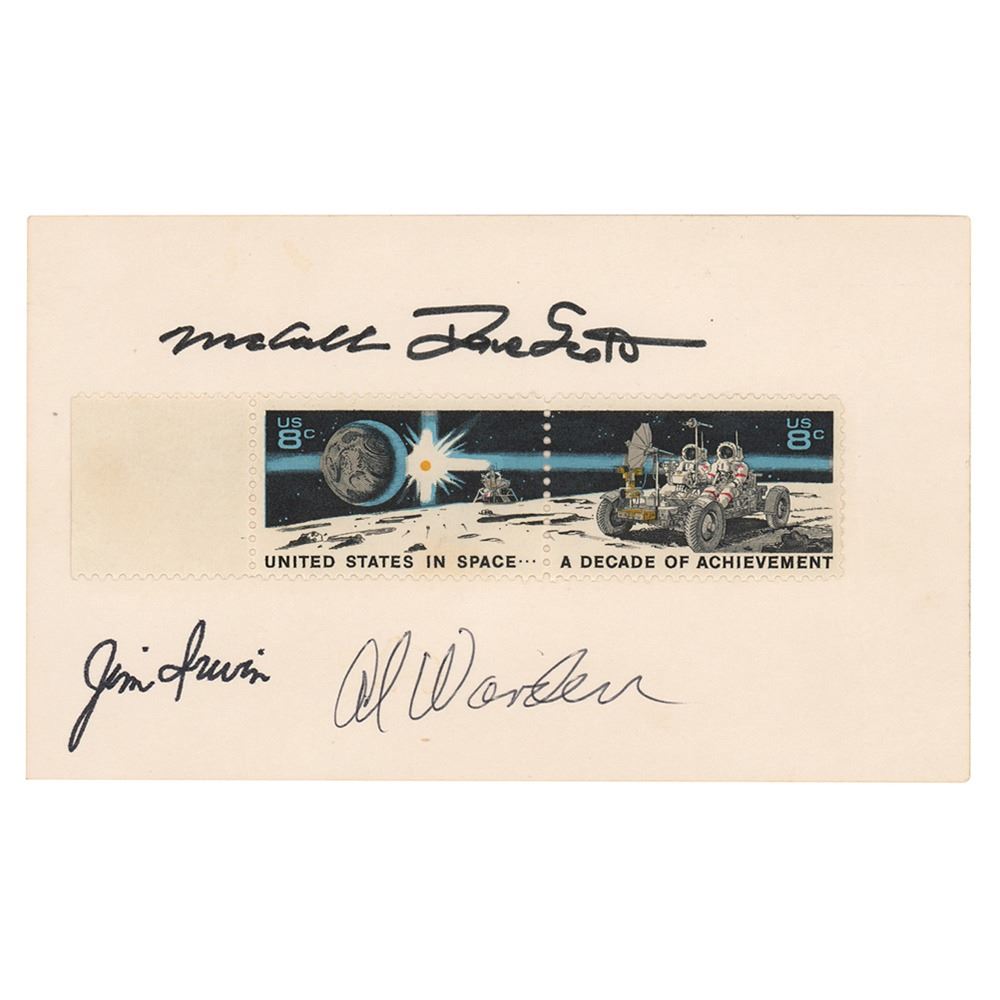 Ink signatures, "Dave Scott," "Jim Irwin," and "Al Worden," on an off-white 5 x 3 card bearing an affixed ‘lunar rover’ stamp block, which is also signed by the stamp designer, Robert McCall. In fine condition. From the collection of aerospace memorabilia specialist Ken Havekotte.