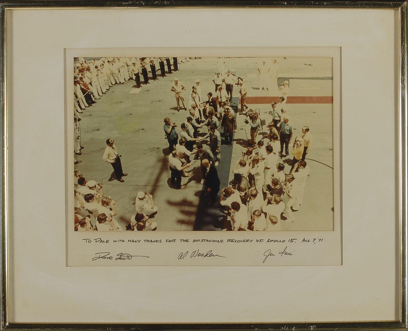 Color glossy 13 x 8.5 photo of the Apollo 15 crew in a receiving line, signed and inscribed in black felt tip on a mat, “To Dale with many thanks for the outstanding recovery of Apollo 15, Aug 7, ‘71” and signed by Dave Scott, Al Worden, and Jim Irwin. Double-matted and framed to an overall size of 21 x 17. In very good condition, with mild emulsion crazing.