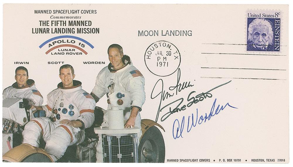 Commemorative cover, 6.5 x 3.75, with a cachet honoring The Fifth Manned Lunar Landing Mission-Apollo 15 Lunar Land Rover, signed in black felt tip by Jim Irwin and Dave Scott, and blue ballpoint by Al Worden. In fine condition.