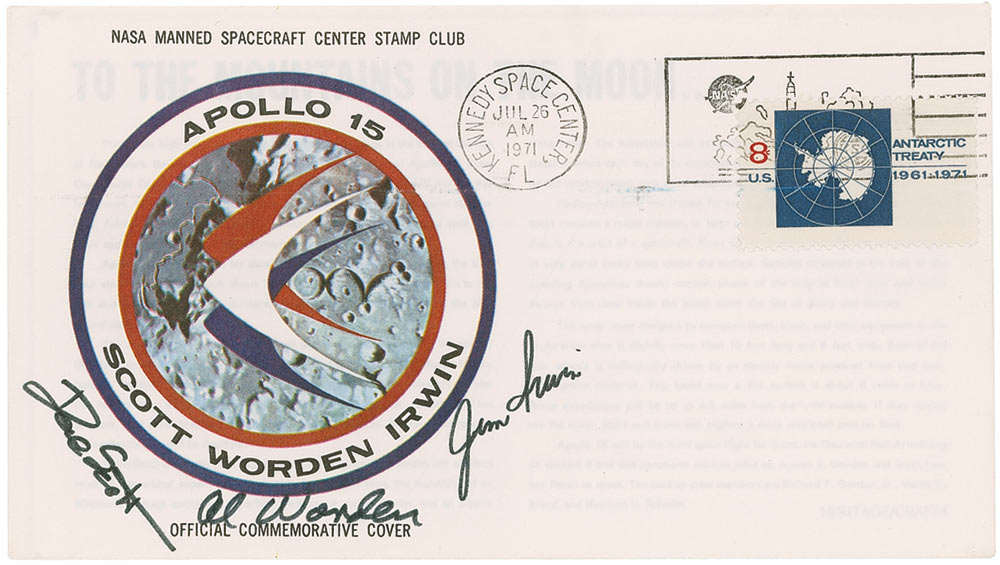 Apollo 15 insurance cover with a cachet of the Apollo 15 mission insignia, signed in black felt tip by Dave Scott, Al Worden, and Jim Irwin. Cover is notated on the reverse by Irwin’s son, “James B. Irwin 59/70.” In fine condition. Accompanied by a certificate of authenticity from Irwin’s son, stating these covers were in his father’s possession until the time of his death.