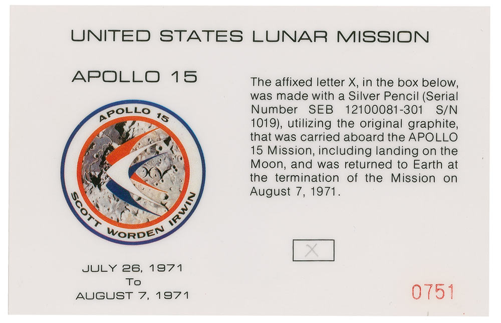 A pencil graphite “X” made from graphite contained within a flight-flown silver pencil carried aboard Apollo 15 and carried to the moon, on an off-white 5.75 x 3.75 presentation card, detailing the history of the pencil and bearing an Apollo 15 insignia. Card has been professionally protectively laminated. Accompanied by a photocopied letter of authenticity from James Irwin stating the pencil was carried to the moon.