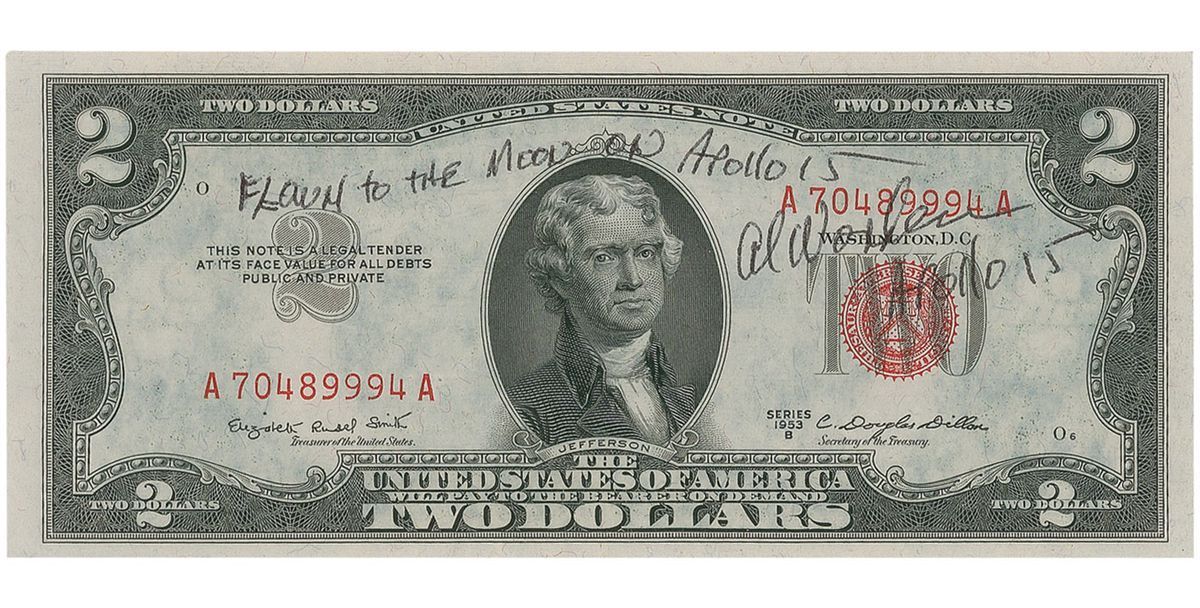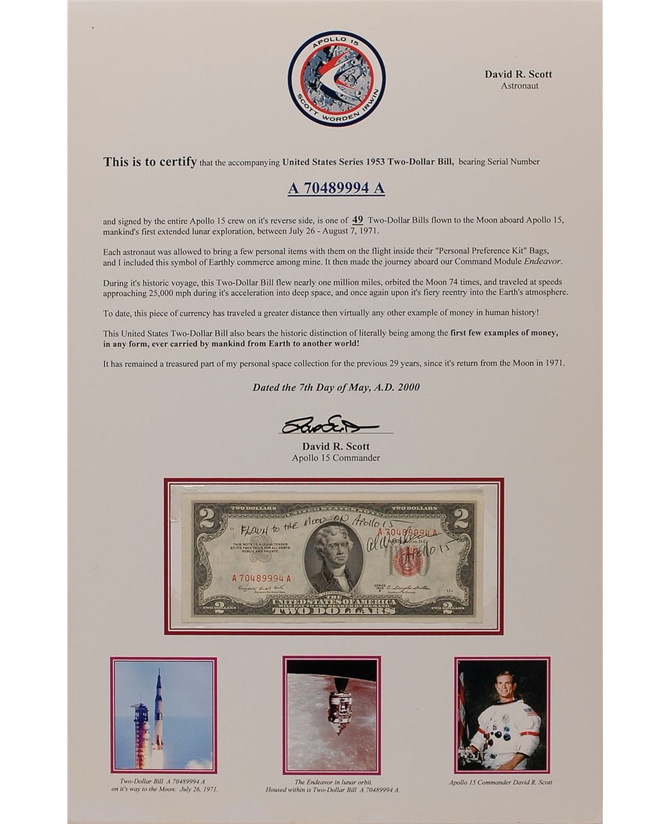 Rare flown Series 1953 B two dollar bill, flown on board the Apollo 15 Command Module as one of 49 two-dollar bills, carried by Dave Scott in his PPK kit. Signed on the portrait side in black ballpoint, “Flown to the Moon on Apollo 15, Al Worden, Apollo 15,” and also signed on the reverse in black felt tip by Dave Scott, Al Worden, and Jim Irwin. Accompanied by a May 7, 2000, letter of authenticity signed by Dave Scott, which reads, in part: “This is to certify that the accompanying United States Series 1953 Two Dollar Bill…signed by the entire Apollo 15 crew on its reverse side is one of 49 Two Dollar Bills flown to the Moon aboard Apollo 15…Each astronaut was allowed to bring a few personal items with them on the flight…and I included this symbol of Earthly commerce among mine. It then made the journey aboard our Command Module Endeavour. During its historic voyage, this two dollar bill flew nearly one million miles, orbited the Moon 74 times, and traveled at speeds approaching 25,000 mph…To date, this piece of currency has traveled a greater distance then virtually any other example of money in human history! This United States Two Dollar bill also bears the historic distinction of literally being among the first few examples of money, in any form, ever carried by mankind from Earth to another world!” Removably presented on a color 11 x 17 informational sheet. In fine condition. As Scott states in his letter, this in an extremely rare crew-signed flown artifact.