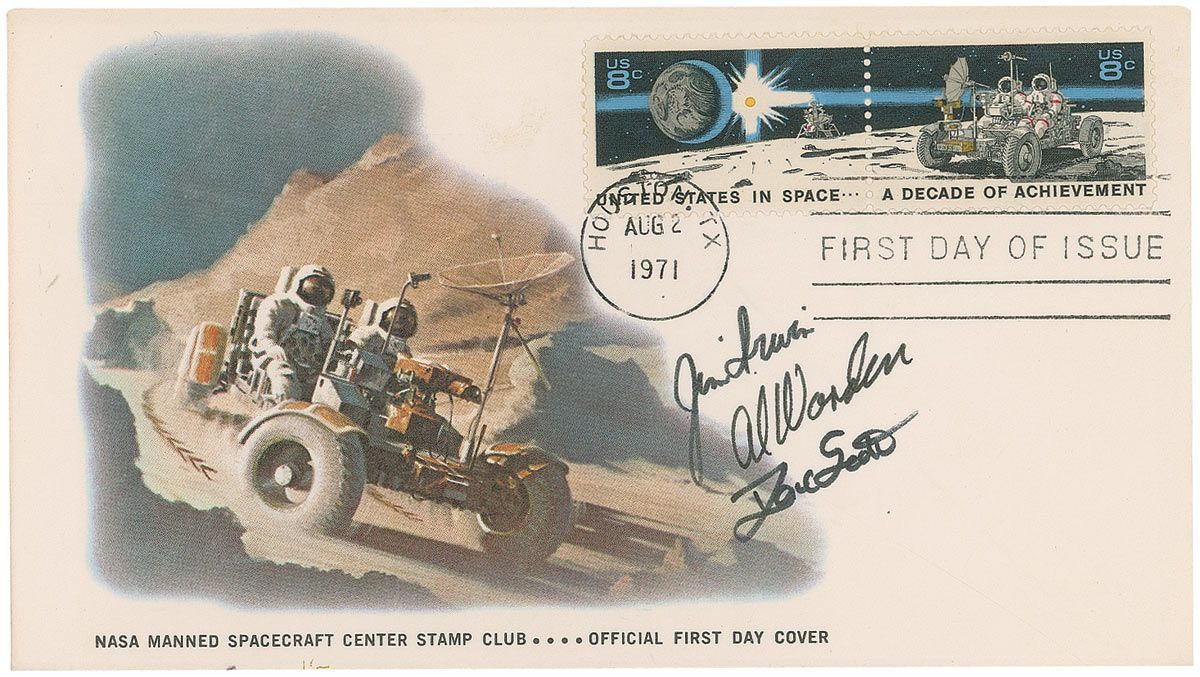 Superb FDC with a color cachet of a lunar rover, issued by the NASA Manned Spacecraft Center Stamp Club, signed in black felt tip by Jim Irwin, Al Worden, and Dave Scott. In fine condition.