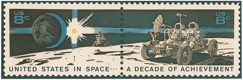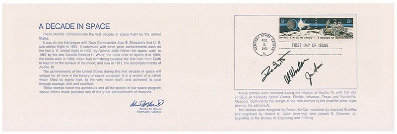 A First Day of Issue philatelic souvenir. Entitled “A Decade of Achievement,” souvenir measures 8 x 5 closed, with an image of two astronauts riding the lunar rover on the cover. Card bears a pre-printed message from the Postmaster General on the inside cover, with two eight-cent commemorative stamps affixed to other side, bearing a First Day of Issue stamp, and an August 2, 1971, Kennedy Space Center cancellation. Signed under the stamps in black felt tip by Dave Scott, Al Worden, and Jim Irwin. In fine condition. Accompanied by the original envelope.