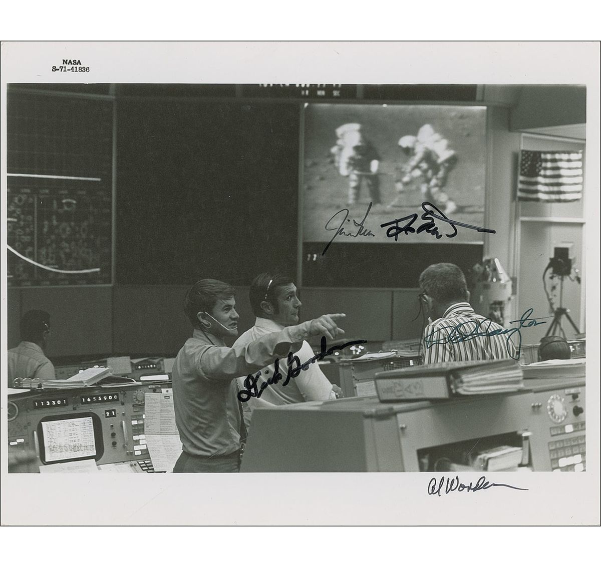 Semi-glossy 9.75 x 8 NASA photo of Dick Gordon and Deke Slayton in Mission Control watching a live image of Jim Irwin and Dave Scott walking on the moon, signed in black felt tip by Jim Irwin, Dave Scott, Dick Gordon, Deke Slayton, and Al Worden. A few scattered light creases, otherwise fine condition. An unusual photo with a great earth–moon connection, signed by all four Apollo astronauts pictured.