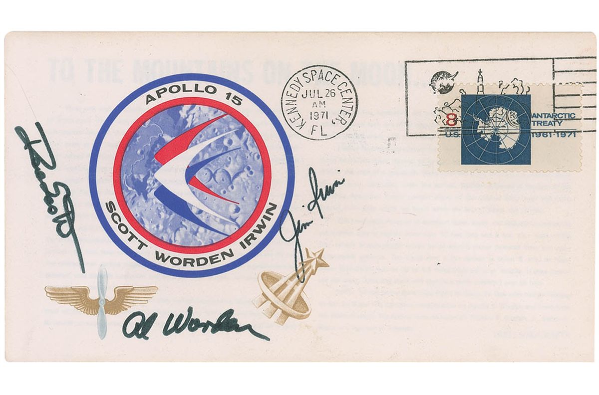 Apollo 15 cover with a cachet honoring the Apollo 15 mission, signed in black felt tip by Dave Scott, Al Worden, and Jim Irwin. In fine condition.