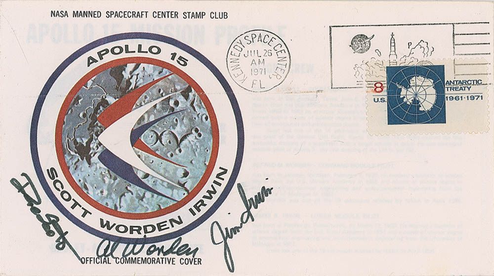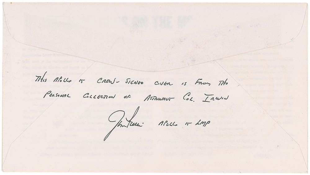Apollo 15 insurance cover, 6.5 x 3.5, with a cachet honoring of the Apollo 15 mission insignia, and bearing a July 26, 1971, Kennedy Space Center postmark, signed in black felt tip by Dave Scott, Al Worden, and Jim Irwin. Reverse bears a handwritten certification from Irwin that reads, “This Apollo 15 crew-signed cover is from the personal collection of Astronaut Col. Irwin. Jim Irwin, Apollo 15 LMP.” In fine condition. Inside of cover bears an Apollo 15 mission profile informational card.
