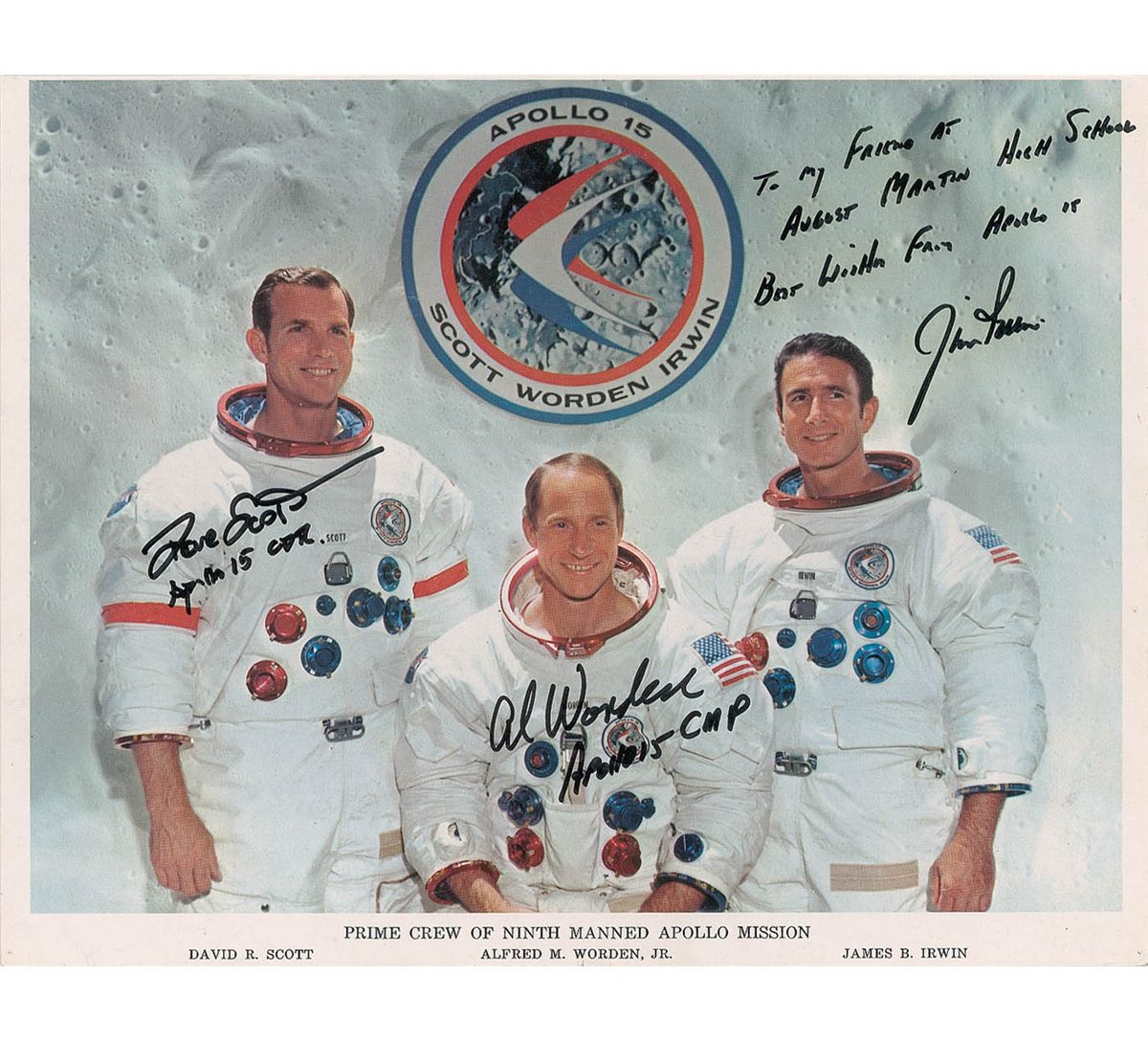 Color 10 x 7.75 NASA photo of the crew in front of the Apollo 15 mission insignia, signed in black felt tip, “Dave Scott, Apollo 15 CDR” and “Al Worden, Apollo 15 CMP,” and signed and inscribed “To my friend at August Martin High School, Best wishes from Apollo 15, Jim Irwin.” Tack holes and light wear to the lower corners, a tack hole to the right border, trimmed top edge, and some mild haloing to Irwin’s signature, otherwise fine condition.