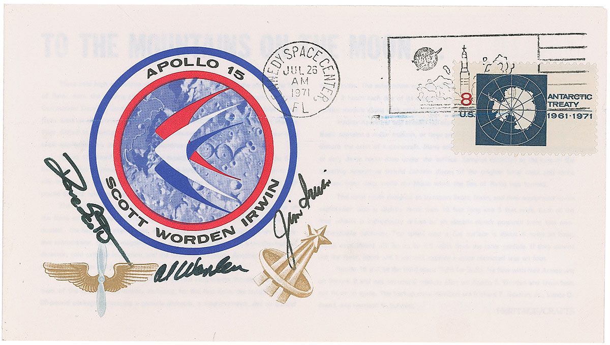Launch day ‘Bishop’ commemorative cover with a cachet honoring Apollo 15, postmarked July 26, 1971, at the Kennedy Space Center, signed in black felt tip by Dave Scott, Al Worden, and Jim Irwin. In fine condition.