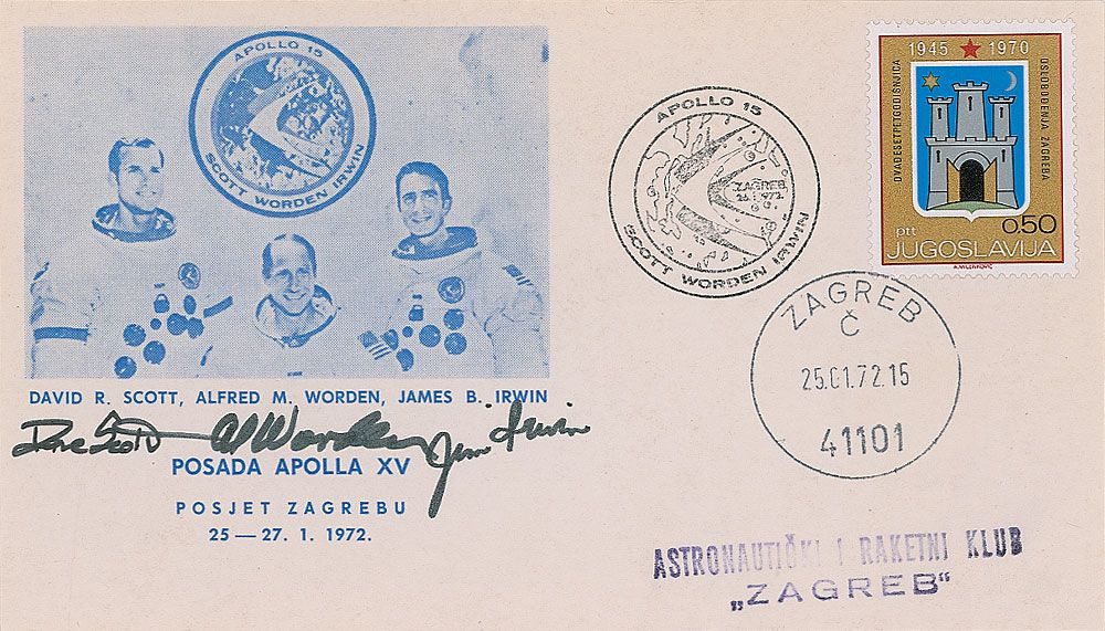 Yugoslavian commemorative cover, 6.25 x 3.5, with a cachet honoring the Apollo 15 crew, signed in black felt tip by Dave Scott, Al Worden, and Jim Irwin. In fine condition.