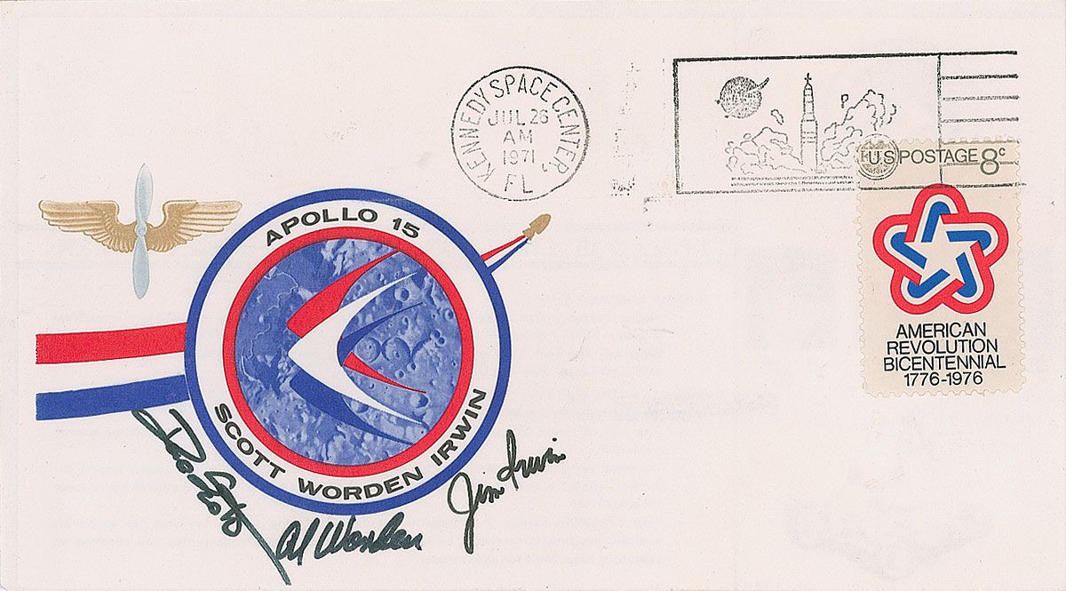 Commemorative cover with a cachet of the Apollo 15 mission insignia, as well as a July 26, 1971, Kennedy Space Center cancellation, signed under the cachet in black felt tip by Dave Scott, Al Worden, and Jim Irwin. In very fine condition.