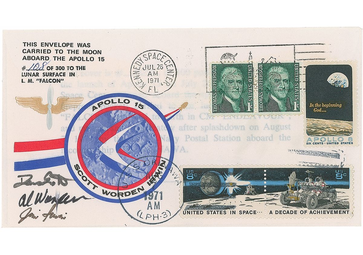 As was common practice on Apollo missions, postal covers and medallions were carried aboard the spacecraft as mementoes. Because of the increased mass of equipment to be carried by the Apollo 15 lunar module (including the Lunar Rover), the number of medallions was halved and 400 postal covers were carried instead. The covers were provided by a German stamp dealer, for which he would retain 100 (not to be sold on the open market) and 300 would be divided among the crew (a fee was also offered, but eventually declined). Several months after the mission, the German stamp dealer advertised his 100 covers for sale. When the situation came to NASA's attention, NASA impounded all of the crew’s covers, which were then deposited in the National Archives. In February 1983, the crew brought legal action against NASA for return of the covers. A settlement was reached quickly and on July 19, 1983, NASA returned the covers to the crew in a private meeting at the National Archives.