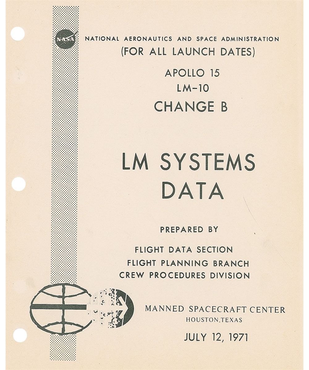 Original unbound manual entitled “Apollo 15, LM-10, Change B, LM Systems Data,” July 12, 1971, 8.5 x 10.5, containing various charts and schematics related to the Lunar Module. Three pages have notations in an unknown hand related to a revision “C,” dated July 21, 1971, just five days before launch. In fine condition.