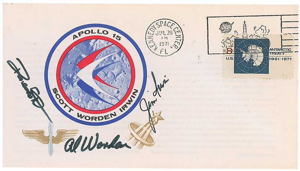 Apollo 15 commemorative cover with a cachet of the mission insignia and gold propeller and wings under the insignia, signed in black felt tip by Dave Scott, Al Worden, and Jim Irwin. In fine condition.