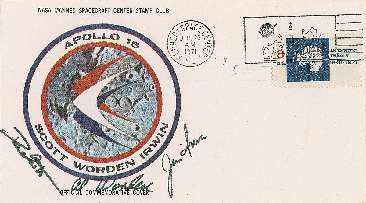 Apollo 15 insurance cover with the Apollo 15 mission emblem, signed in black felt tip by Dave Scott, Al Worden, and Jim Irwin. In very fine condition. Accompanied by an uncommon lengthy, official COA from Herman E. Sieger, the major European stamp dealer notorious for selling the flown Apollo 15 covers which ignited a NASA scandal.