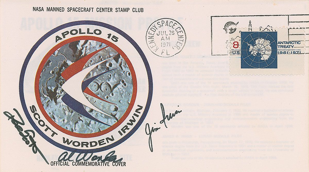 Apollo 15 insurance cover with a cachet of the Apollo 15 mission insignia, signed in black felt tip by Dave Scott, Al Worden, and Jim Irwin. Cover is also signed in the inside of the flap, “From my personal collection, Al Worden, Apollo 15 CMP, #99 AMW.” In fine condition. Accompanied by a certificate of authenticity from Al Worden.