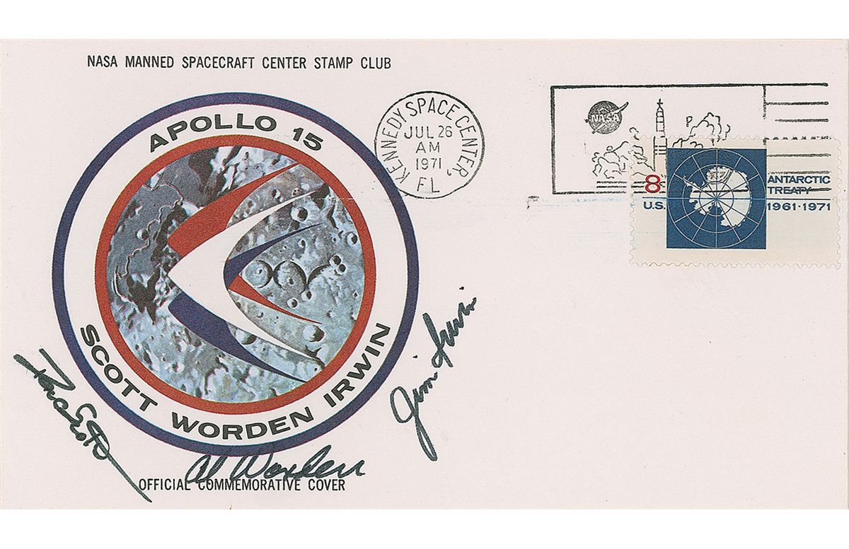 Apollo 15 insurance cover, 6.5 x 3.5, with a cachet of the Apollo 15 mission insignia, and bearing a July 26, 1971, Kennedy Space Center postmark, signed in black felt tip by Dave Scott, Al Worden, and Jim Irwin. In very fine condition.