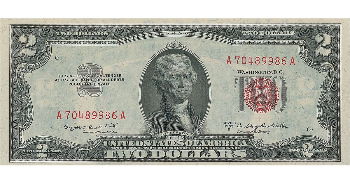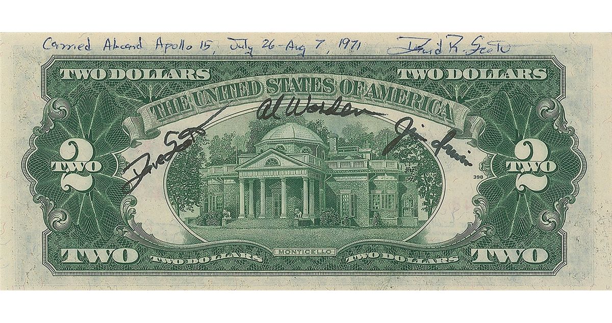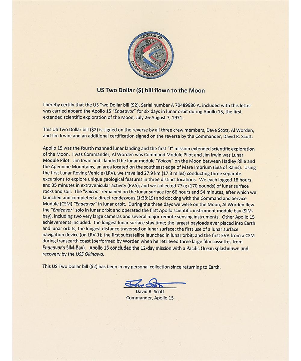 Flown Series 1953B two dollar bill, serial number A70489986A, signed across the top of the reverse in blue ballpoint, “Carried aboard Apollo 15, July 26–Aug 7, 1971, David R. Scott,” and also signed in black felt tip, “Dave Scott,” “Al Worden,” and “Jim Irwin.” Accompanied by a certificate of authenticity from Dave Scott, which reads, in part: “I hereby certify that the US Two Dollar Bill ($2), Serial number A 70489986A, included with this letter was carried aboard the Apollo 15 ‘Endeavour’ for six days in lunar orbit during Apollo 15…This US Two Dollar Bill…is signed on the reverse by all three crew members…and an additional certification signed on the reverse by the Commander, David R. Scott…This US Two Dollar bill…has been in my personal collection since returning to Earth.” In very fine condition. Carried as a good luck symbol on many space flights, a total of 50 two-dollar bills were flown to lunar orbit on this mission. Another package of currency was taken to the lunar surface, but accidentally left behind.