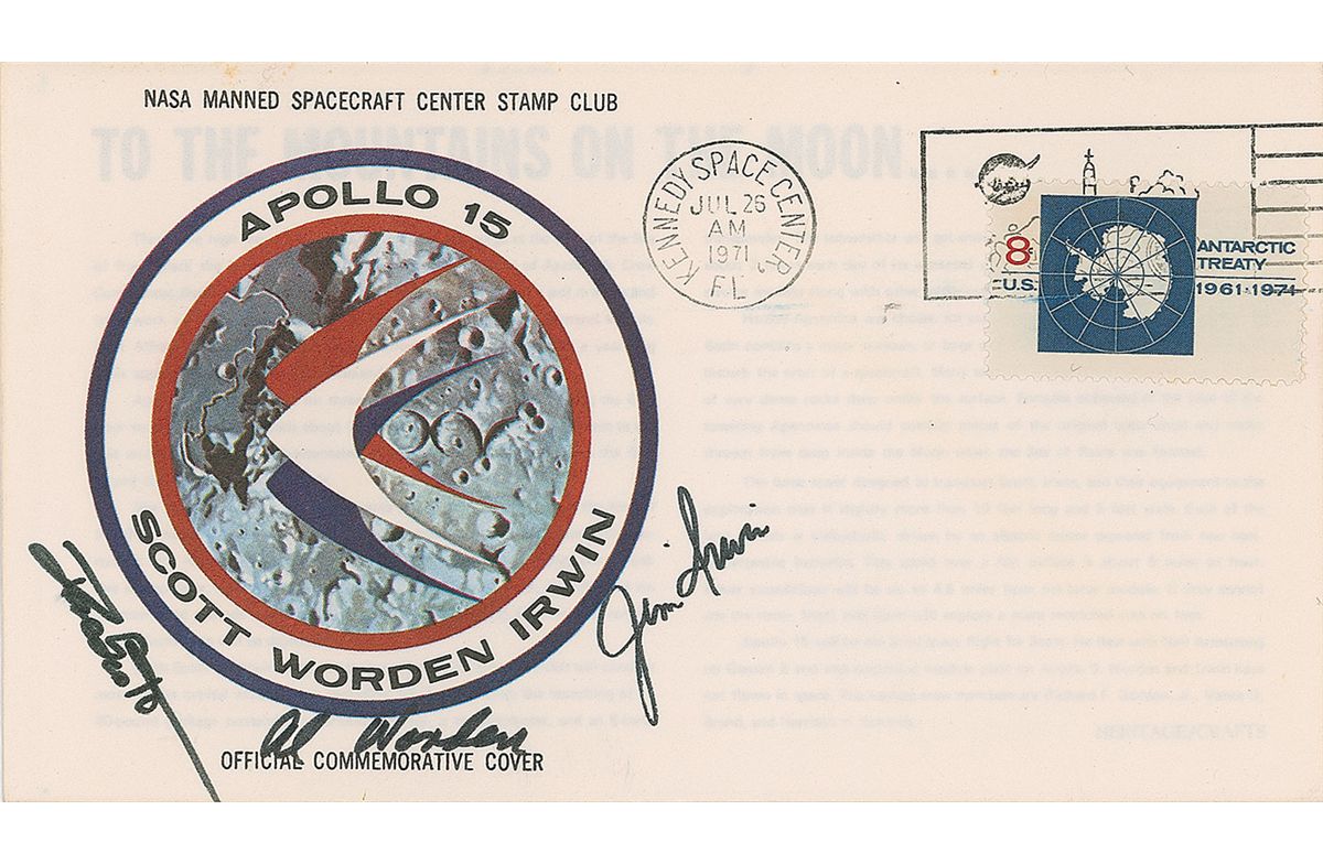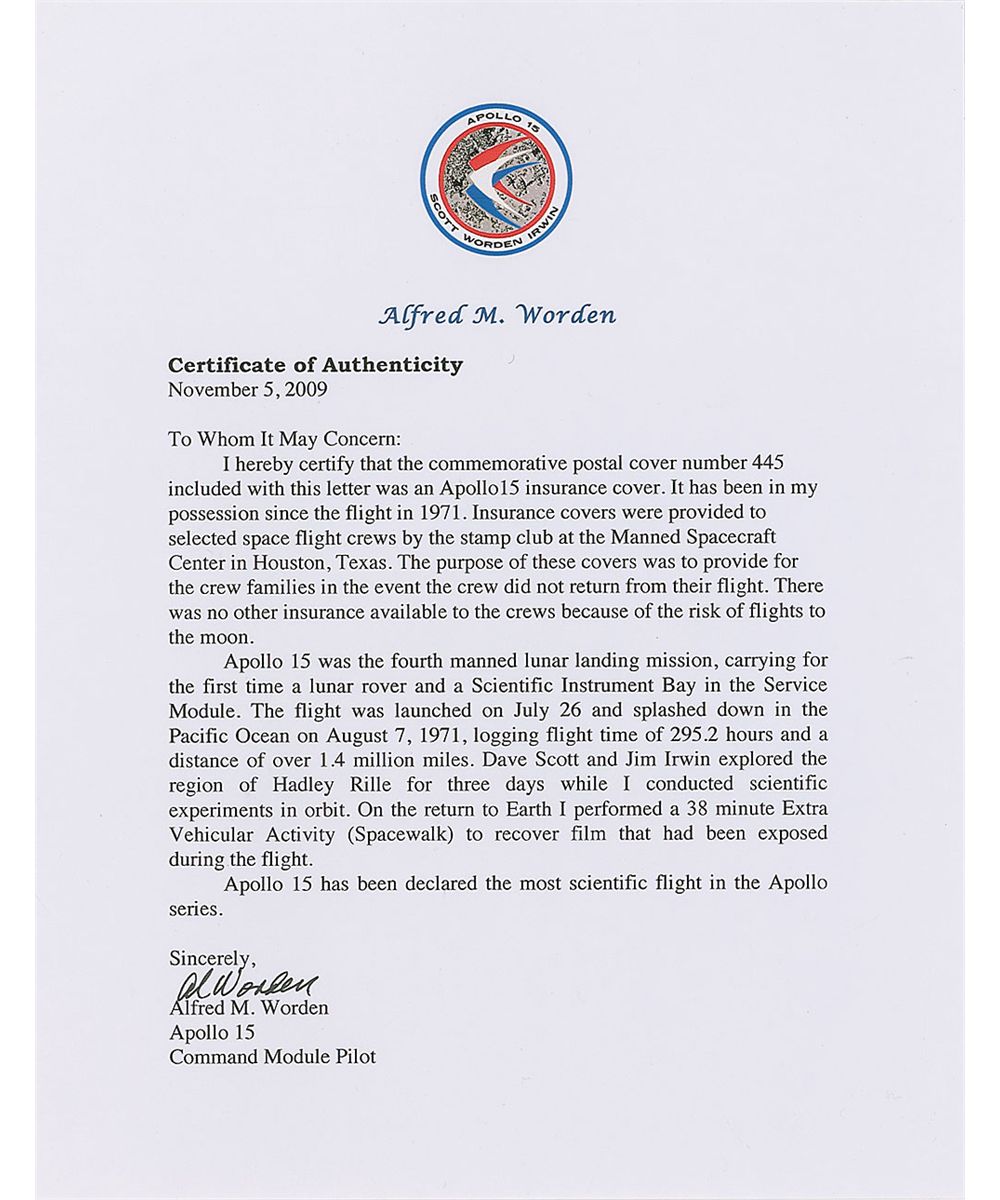Apollo 15 insurance cover, 6.5 x 3.5, with a cachet of the Apollo 15 mission insignia, and bearing a July 26, 1971, Kennedy Space Center postmark, signed in black felt tip by Dave Scott, Al Worden, and Jim Irwin. Also signed inside the flap, “From my personal collection. Al Worden, Apollo 15 CMP,” and numbered “#445.” In fine condition. Accompanied by a letter of authenticity from Worden which states, “I hereby certify that the commemorative postal cover number 445…was an Apollo 15 insurance cover. It has been in my possession since the flight in 1971.”