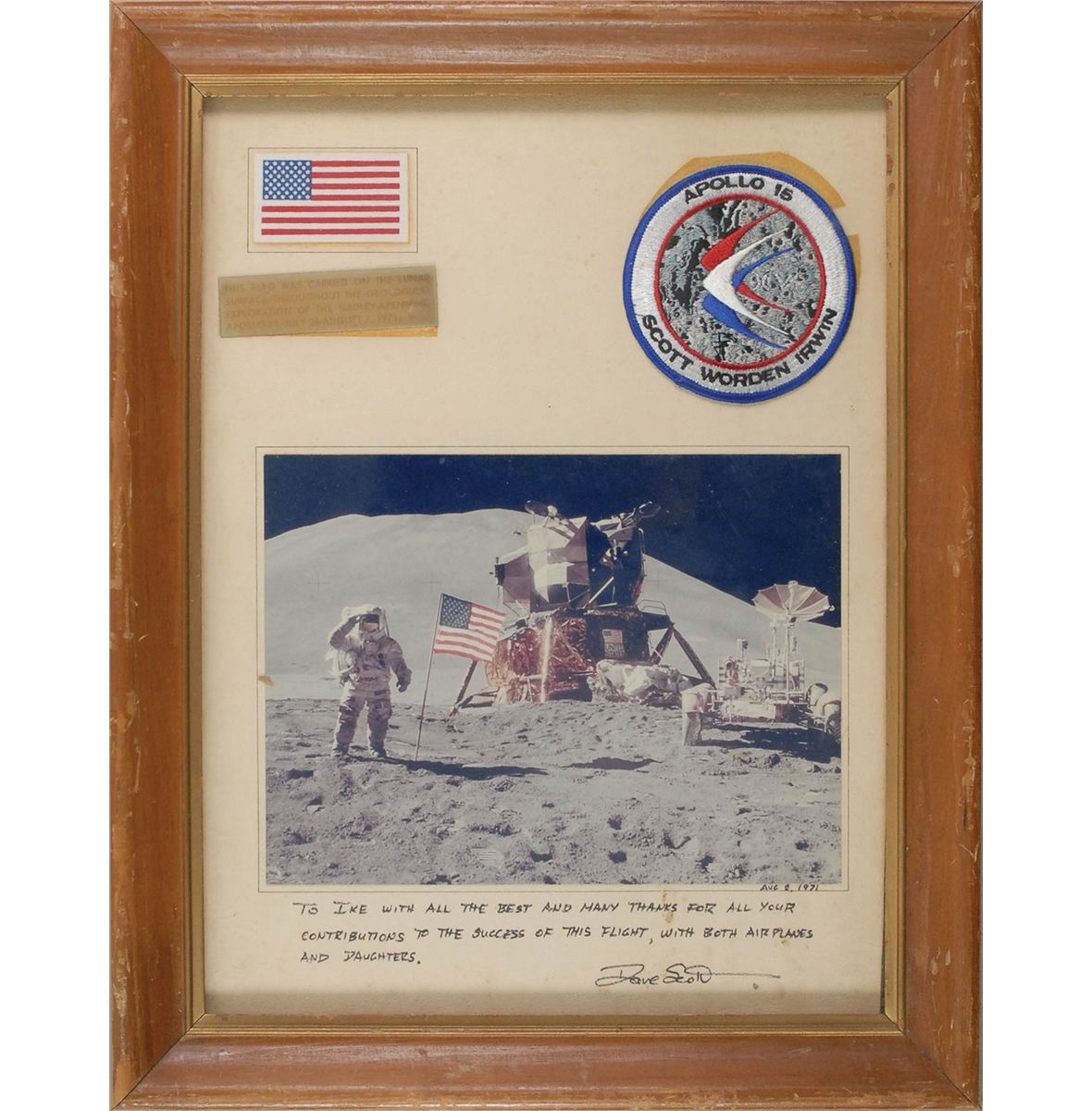 Printed Beta cloth American flag, 2.5 x 1.75, carried on the lunar surface during all three Apollo 15 moonwalks. Flag is affixed to an 11.5 x 15.5 presentation mount, with a printed caption underneath stating, “This flag was carried on the lunar surface throughout the geological exploration of the Hadley-Apennine, Apollo 15, July 26–August 7, 1971.” Also affixed to the mount is a 9.75 x 7.25 color photo of Dave Scott saluting the flag on the lunar surface, signed and inscribed to Dave Scott's father-in-law at the time, Gen. Issac Ott, in black felt tip on the mount, “To Ike, with all the best and many thanks for all your contributions to the success of this flight, with both airplanes and daughters. Dave Scott,” adding “Aug. 2, 1971,” under the photo; and an extremely rare Apollo 15 ‘Silver XV’ crew patch. Presentation is framed to an overall size of 14.5 x 18.5. Patch and printed caption partially separated from mount, uniform fading to printed caption, and a bit of light foxing to the mount, otherwise fine condition. While at least one full flag kit was carried into lunar orbit on this mission, flags directly from the lunar surface are exceptionally rare.