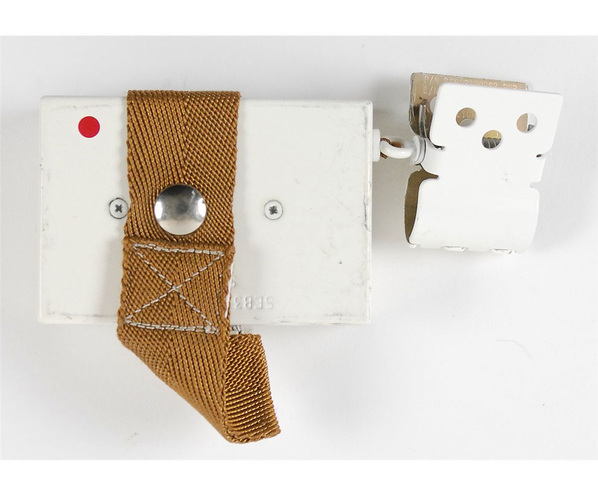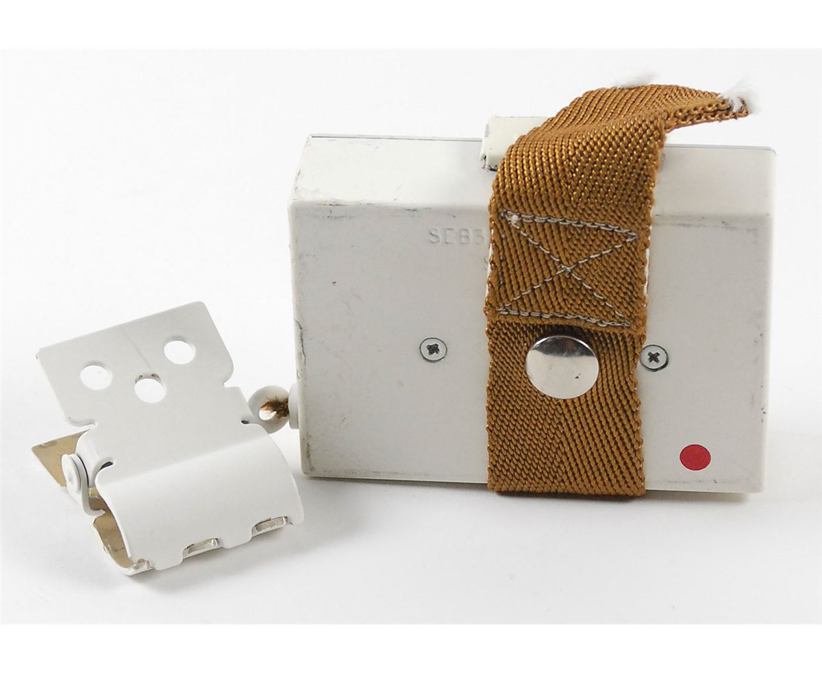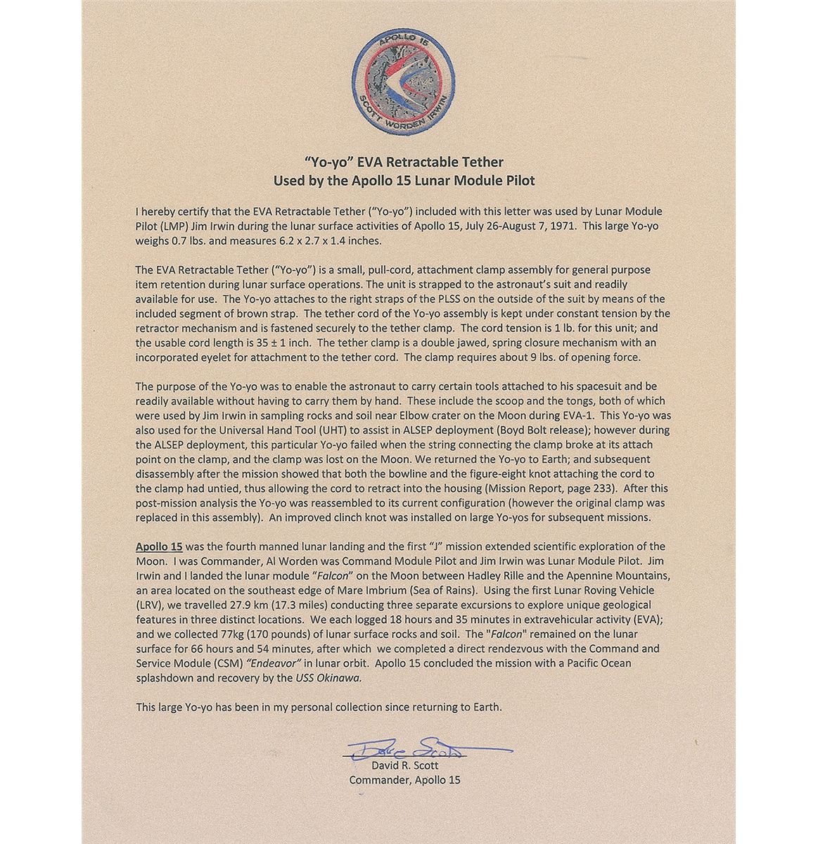 Flown lunar surface EVA retractable tether used on the lunar surface by Apollo 15 Lunar Module Pilot Jim Irwin. The tether, referred to by astronauts as a ‘yo-yo,’ is stamped with a part number of SEB33100291-303 and serial number SN 1025. The device measures approximately 6.25 x 2.75 x 1.5, 0.7 pounds, with remnants of its original brown strap used to attach it to Irwin’s PLSS and to carry tools during lunar surface operations. Attached to the end of the 35? retractable cord is a replacement double-jawed spring-closing mechanism with an incorporated eyelet for attachment to the tether cord. In fine condition. Accompanied by a signed letter of authenticity from Dave Scott which reads, in part: “I hereby certify that the EVA Retractable Tether (‘Yo-yo’) included with this letter was used by Lunar Module Pilot (LMP) Jim Irwin during the lunar surface activities of Apollo 15…The purpose of the Yo-yo was to enable the astronaut to carry certain tools attached to his spacesuit and be readily available without having to carry them by hand. These include the scoop and tongs, both of which were used by Jim Irwin in sampling rocks and soil near Elbow crater on the Moon during EVA-1. This Yo-yo was also used for the Universal Hand Tool (UHT) to assist in ALSEP deployment (Boyd Bold release); however during the ALSEP deployment, this particular Yo-yo failed when the string connecting the clamp broke at its attach point on the clamp, and the clamp was lost on the Moon. We returned the Yo-yo to Earth; and subsequent disassembly after the mission showed that both the bowline and the figure-eight knot attaching the cord to the clamp had untied, thus allowing the cord to retract into the housing…After this post-mission analysis the Yo-yo was reassembled to its current configuration (however the original clamp was replaced in this assembly). An improved clinch knot was installed on large Yo-yos for subsequent missions." As noted in the Apollo 15 Mission Report (chapter 14, 5.7), both retractable tethers failed during lunar surface operations; the Commander's tether cord broke during the first extravehicular activity, and the tool clamp came off the end of the Lunar Module Pilot's tether.