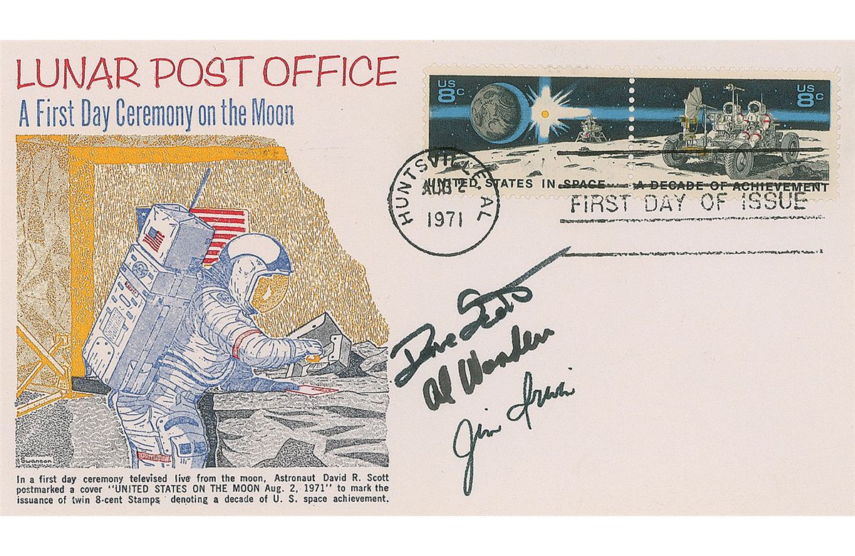 FDC with a cachet honoring the broadcast of Dave Scott postmarking a cover on the lunar surface, signed in black felt tip by Dave Scott, Al Worden, and Jim Irwin. In very fine condition.