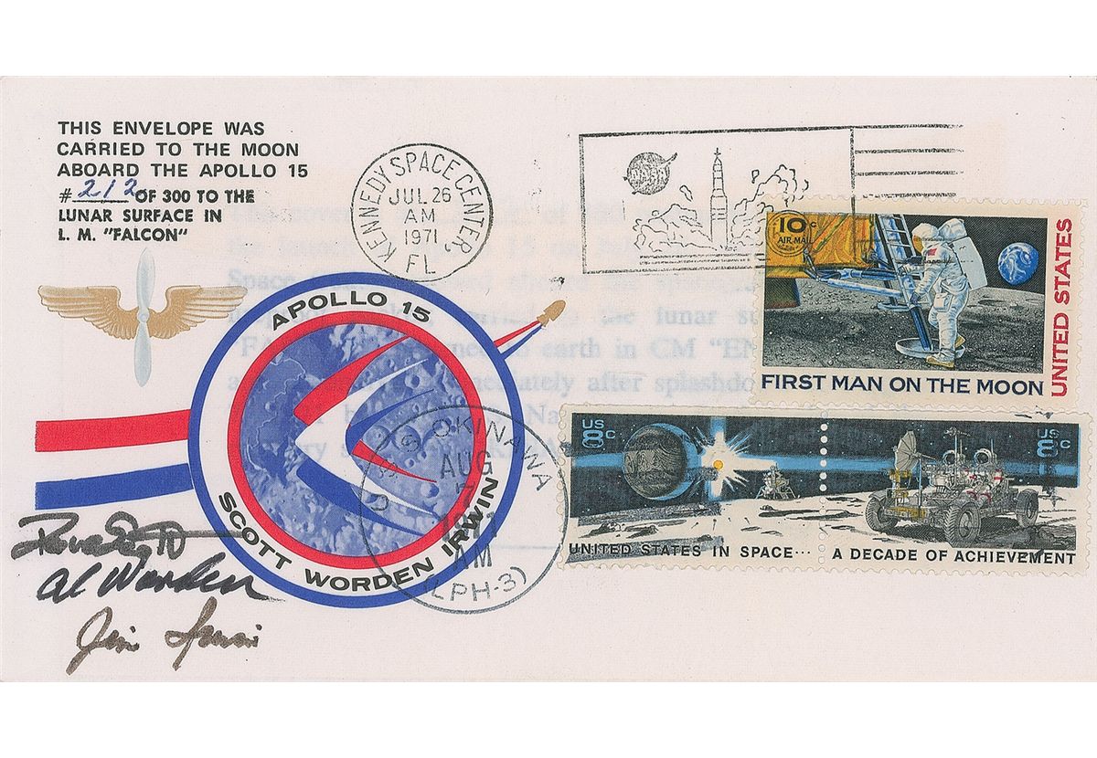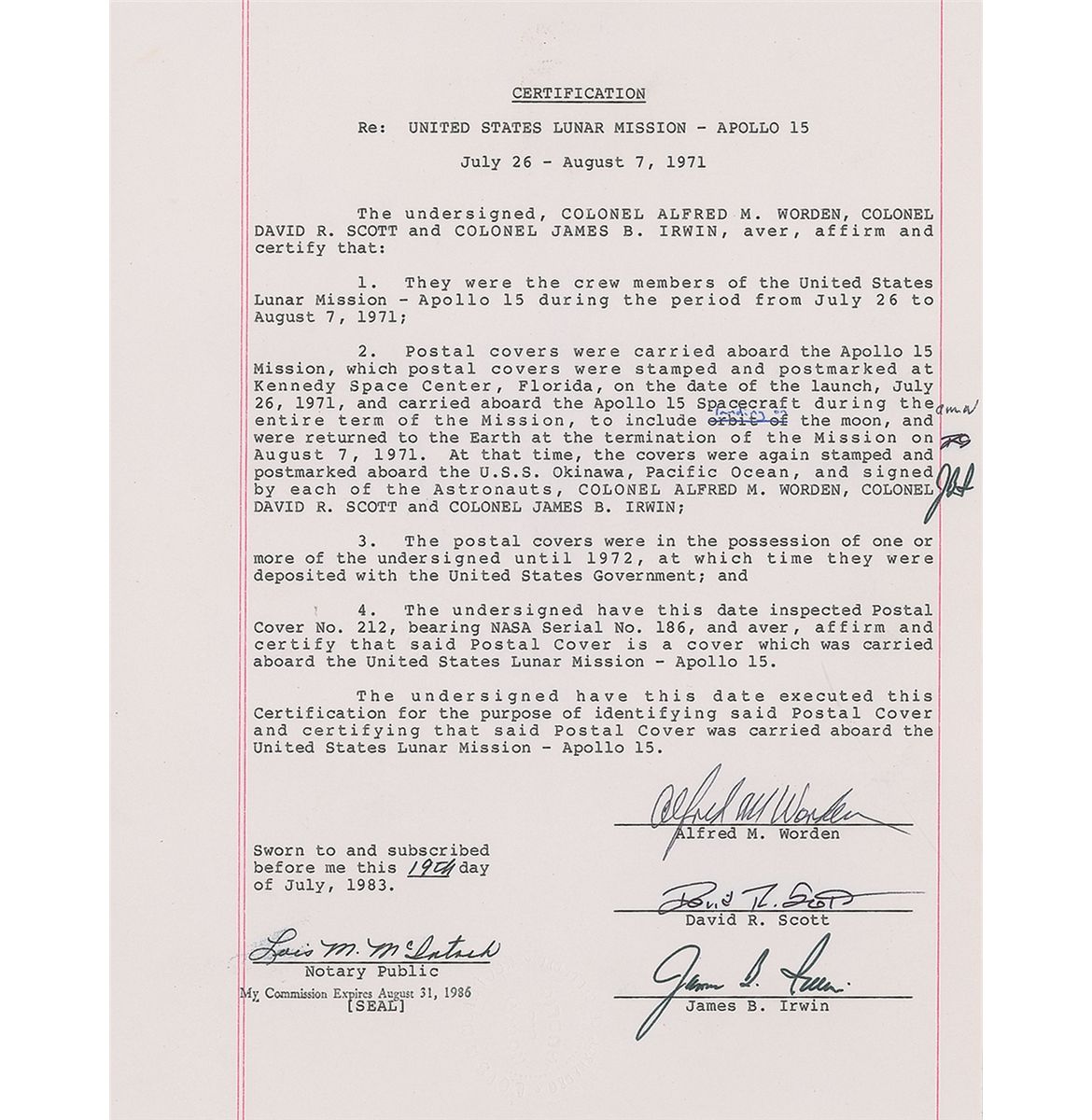 Uncommon Apollo 15 postal cover, 6.5 x 3.75, numbered 212 of 300, carried to the lunar surface aboard the Falcon, signed in the lower left corner by crew members Dave Scott, Al Worden, and Jim Irwin. In fine condition. This particular cover comes from astronaut Dave Scott’s personal collection, and retains its original informational card insert, also signed by Scott. Accompanied by a one-page typed notarized certification, signed “Alfred M. Worden,” “David R. Scott,” and “James B. Irwin.” The provenance reads in part: “Postal covers were carried aboard the Apollo 15 Mission, which postal covers were stamped and postmarked at Kennedy Space Center, Florida, on the date of the launch, July 26, 1971, and carried aboard the Apollo 15 Spacecraft during the entire term of the Mission, to include landing on the moon and were returned to the Earth at the termination of the Mission on August 7, 1971…The postal covers were in the possession of one or more of the undersigned until 1972, at which time they were deposited with the United States Government…The undersigned have this date inspected Postal Cover No. 212, bearing NASA Serial No. 186, and aver, affirm and certify that said Postal Cover is a cover which was carried aboard the United States Lunar Mission—Apollo 15.” All three crew members have also added their initials to a small correction in the text. Also included is a two-page letter of authenticity signed by Dave Scott, which reads, in part: “I hereby certify that the postal cover No. 212 included with this letter was carried to the lunar surface aboard the Lunar Module Falcon.” Scott goes on to recall the history of these covers and their eventual return to the Apollo 15 crew. In fine condition.
