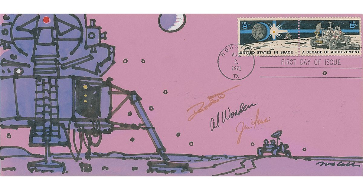 Fantastic original signed Robert McCall felt tip sketch of the Apollo 15 lunar module on the moon’s surface, with the manned lunar rover in the background, on a light purple 9.25 x 4 FDC. Signed in brown felt tip by Dave Scott and Jim Irwin and in black felt tip by Al Worden. Also signed in felt tip by the artist, Robert T. McCall. In fine condition, with light erased pencil remnants from a previous address.