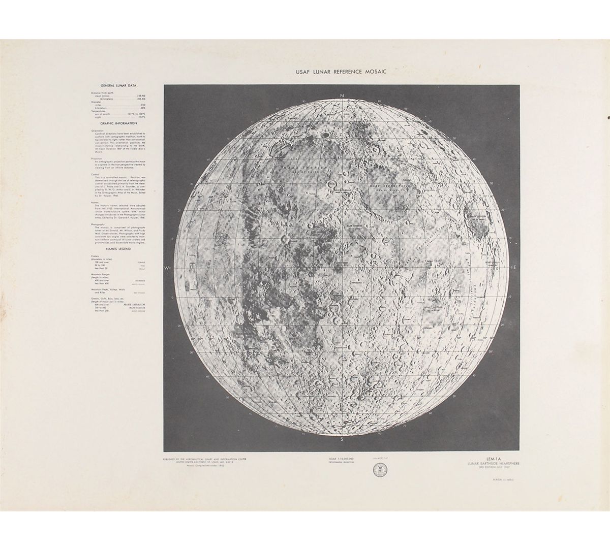 Collection of three original lunar charts, all measuring 22? x 17?, one entitled, “Lunar Earthside Chart,” another entitled “USAF Lunar Reference Mosaic,” and one untitled, which shows the Apollo 15 landing area at Hadley Rille. Rolled and in fine condition, with some scattered light toning and foxing.