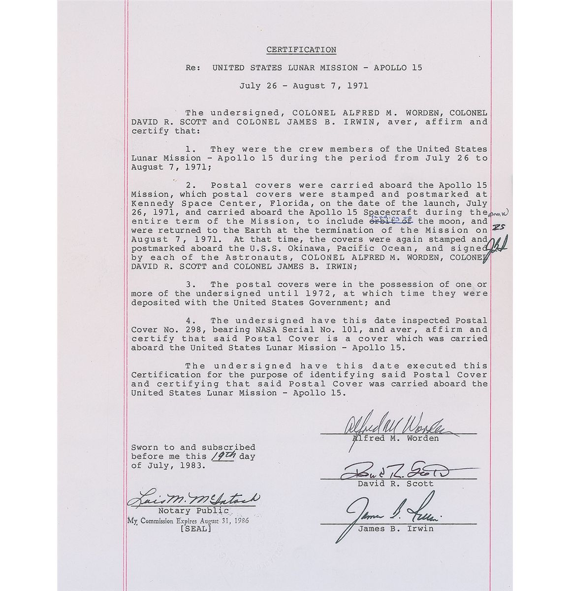 Uncommon Apollo 15 postal cover, 6.5 x 3.75, numbered 298 of 300, carried to the lunar surface aboard the Falcon, signed in the lower left corner by crew members Dave Scott, Al Worden, and Jim Irwin. In fine condition. This particular cover comes from astronaut Dave Scott’s personal collection, and retains its original informational card insert. Accompanied by a one-page typed notarized certification, signed “Alfred M. Worden,” “David R. Scott,” and “James B. Irwin.” The provenance reads in part: “Postal covers were carried aboard the Apollo 15 Mission, which postal covers were stamped and postmarked at Kennedy Space Center, Florida, on the date of the launch, July 26, 1971, and carried aboard the Apollo 15 Spacecraft during the entire term of the Mission, to include landing on the moon and were returned to the Earth at the termination of the Mission on August 7, 1971…The postal covers were in the possession of one or more of the undersigned until 1972, at which time they were deposited with the United States Government…The undersigned have this date inspected Postal Cover No. 212, bearing NASA Serial No. 298, and aver, affirm and certify that said Postal Cover is a cover which was carried aboard the United States Lunar Mission—Apollo 15.” All three crew members have also added their initials to a small correction in the text. Also included is a two-page letter of authenticity signed by Dave Scott, which reads, in part: “I hereby certify that the postal cover No. 298 included with this letter was carried to the lunar surface aboard the Lunar Module Falcon.” Scott goes on to recall the history of these covers and their eventual return to the Apollo 15 crew. In fine condition.