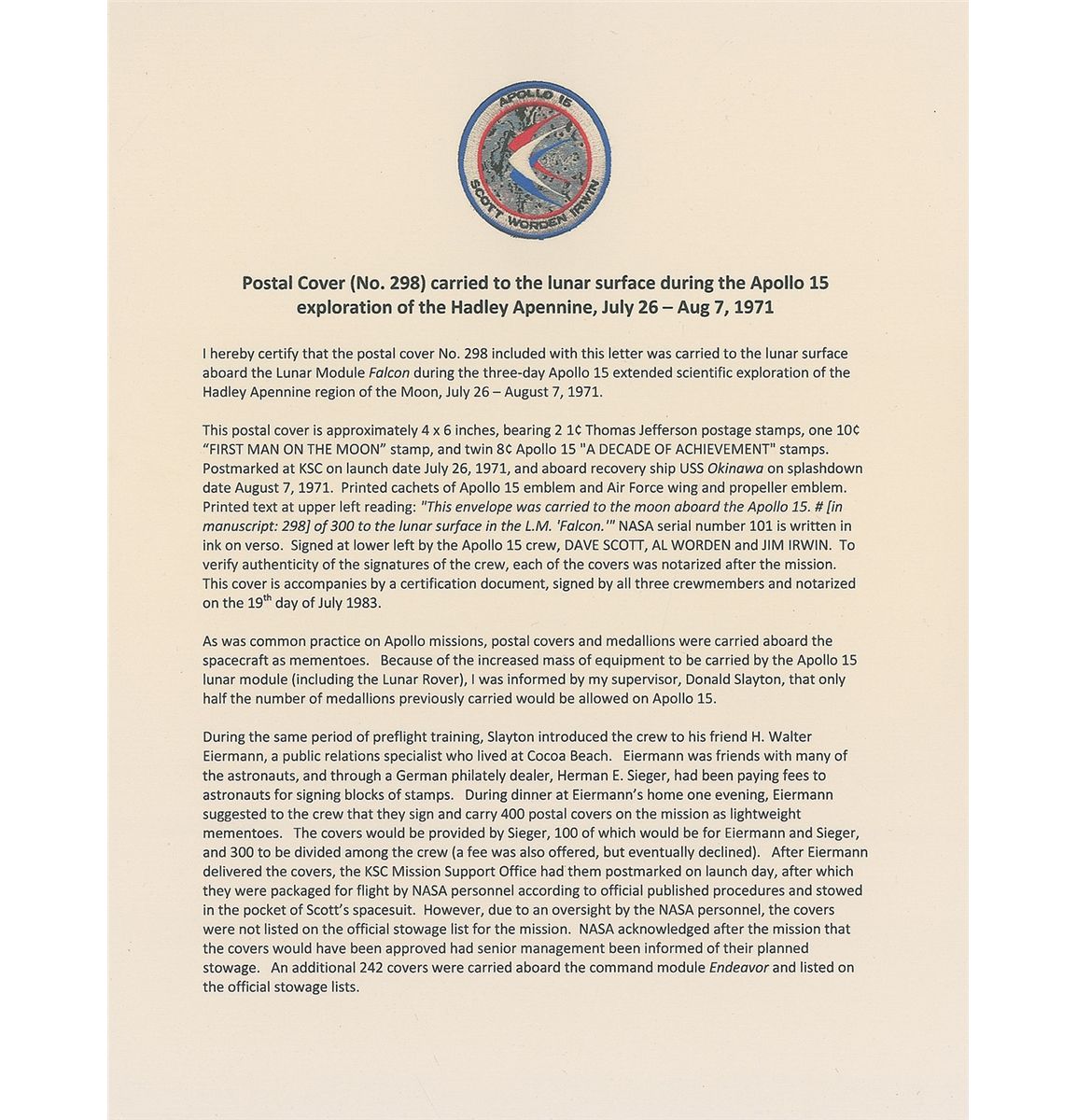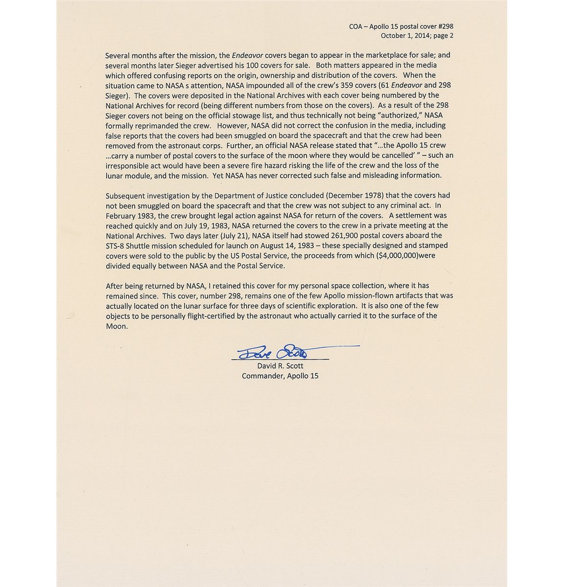 As was common practice on Apollo missions, postal covers and medallions were carried aboard the spacecraft as mementoes. Because of the increased mass of equipment to be carried by the Apollo 15 lunar module (including the Lunar Rover), the number of medallions was halved and 400 postal covers were carried instead. The covers were provided by a German stamp dealer, who would retain 100 (not to be sold on the open market), and 300 would be divided among the crew (a fee was also offered, but eventually declined). Several months after the mission, the German stamp dealer advertised his 100 covers for sale. When the situation came to NASA's attention, NASA impounded all of the crew’s covers, which were then deposited in the National Archives. In February 1983, the crew brought legal action against NASA for return of the covers. A settlement was reached quickly and on July 19, 1983, NASA returned the covers to the crew in a private meeting at the National Archives. During the settlement, the crew signed a notarized letter of provenance for each cover. The legal document is, of course, specific in its detail, noting that the postal covers “were carried aboard the Apollo 15 Mission…and carried aboard the Apollo 15 Spacecraft during the entire term of the Mission to include…the moon, and were returned to the Earth at the termination of the Mission on August 7, 1971.” The trail of the offered cover is a piece of space collectible legend, with provenance that tells the story in great detail.