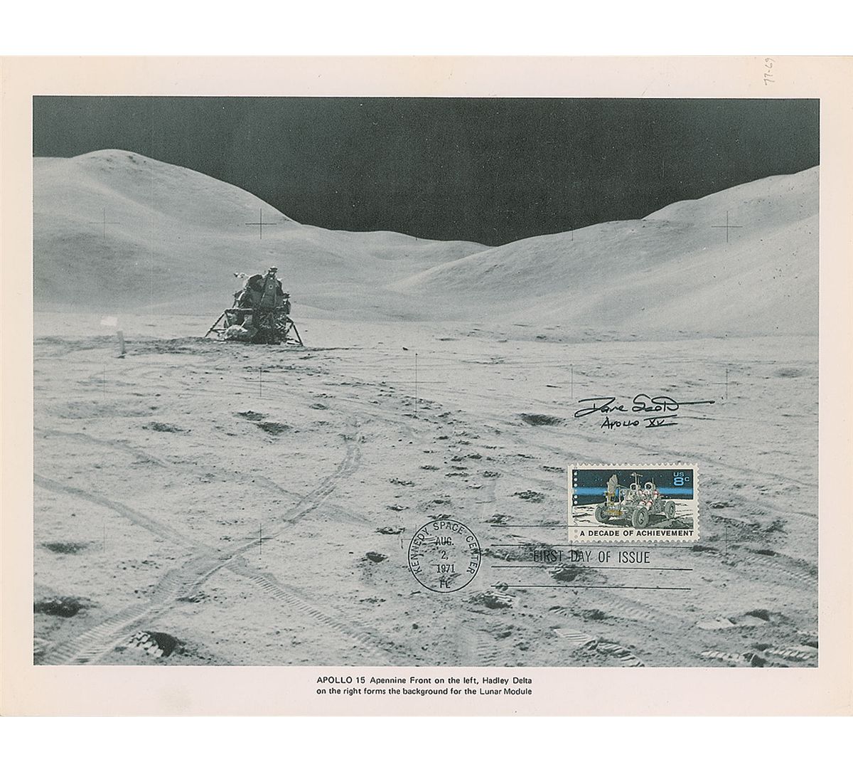 Three 11 x 8.5 lithographs of images from the Apollo 15 mission, all bearing ‘first day’ postal cancellations, including: one of Irwin walking away from the rover, signed in black felt tip, “Jim Irwin, Apollo 15”; one of the Lunar Module, signed in black felt tip, “Dave Scott, Apollo XV”; and one of an astronaut near the rover, signed in black felt tip, “Dave Scott, GT-9, A9, A15.” Light corner tip dings, a couple small pencil notations to borders, and irregular adhesion to the Irwin signature and one Scott signature, otherwise overall fine condition.