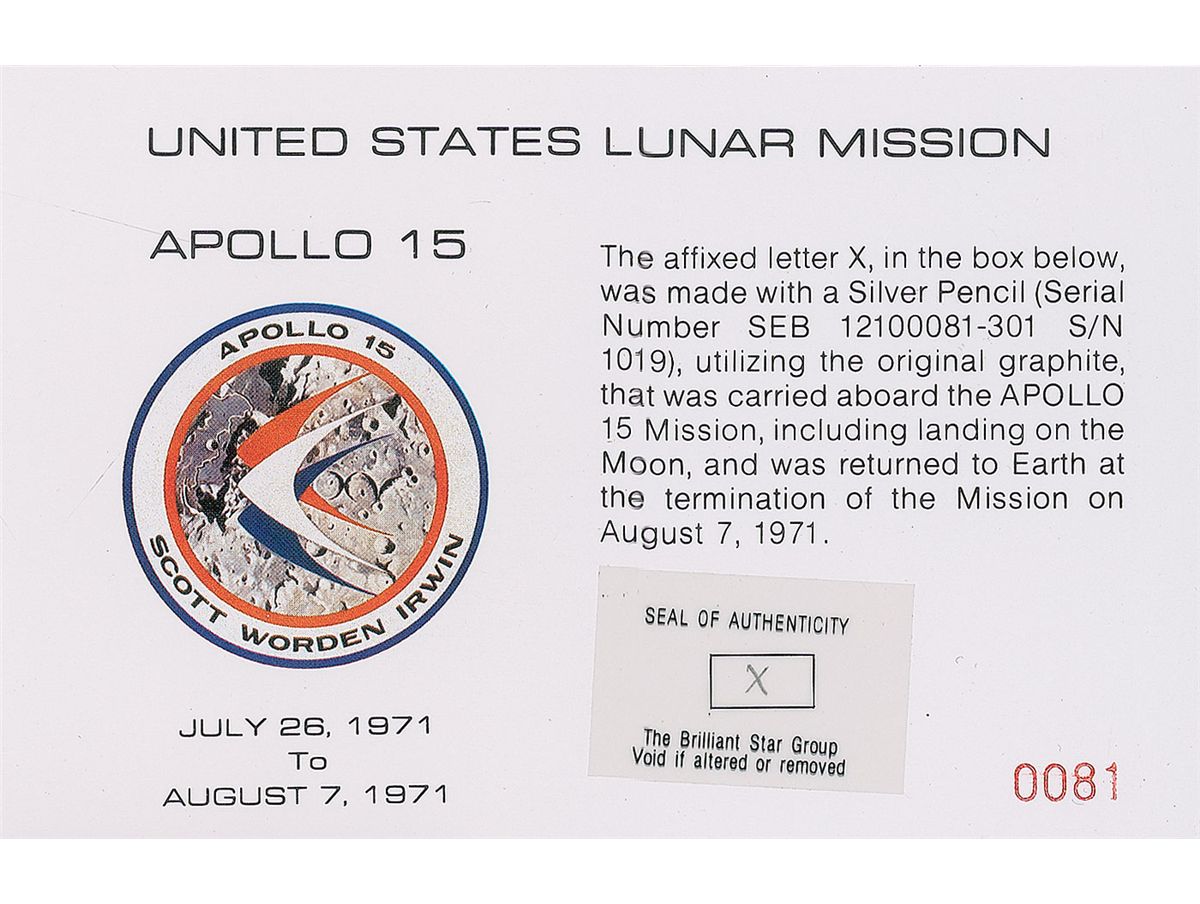 A graphite pencil “X” made with a pencil carried on board the Apollo 15 mission, written on a 5.75 x 3.75 card printed with the mission emblem and text reading, in part: “The affixed letter X…was made with a Silver Pencil (Serial Number SEB 12100081-301 S/N 1019) utilizing the original graphite that was carried aboard the Apollo 15 mission”; and an unflown 1.5 x 1.5 swatch of the material used to make the Lunar Rover High Gain Antenna, taken from the batch of material used for Apollo 15. In overall fine condition.