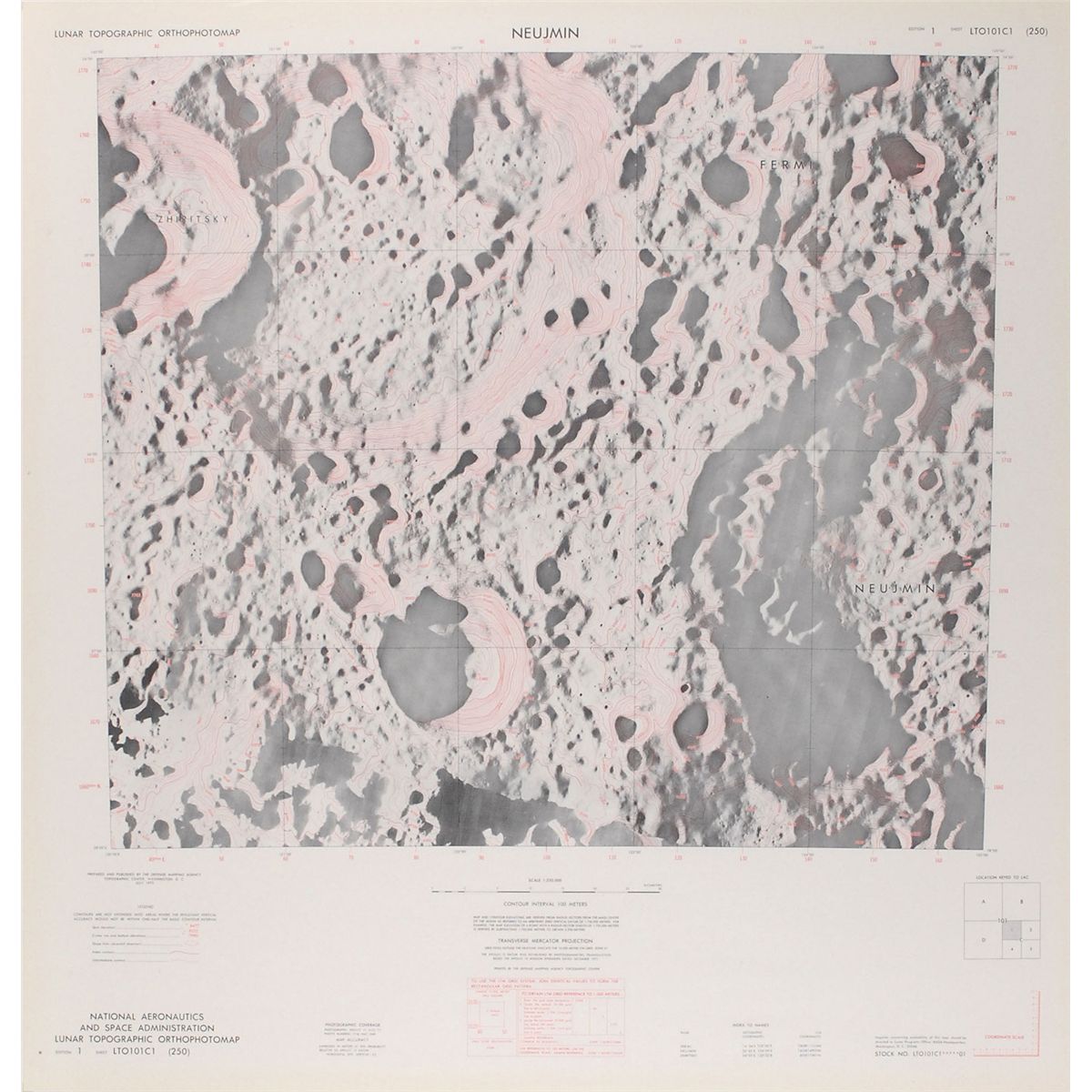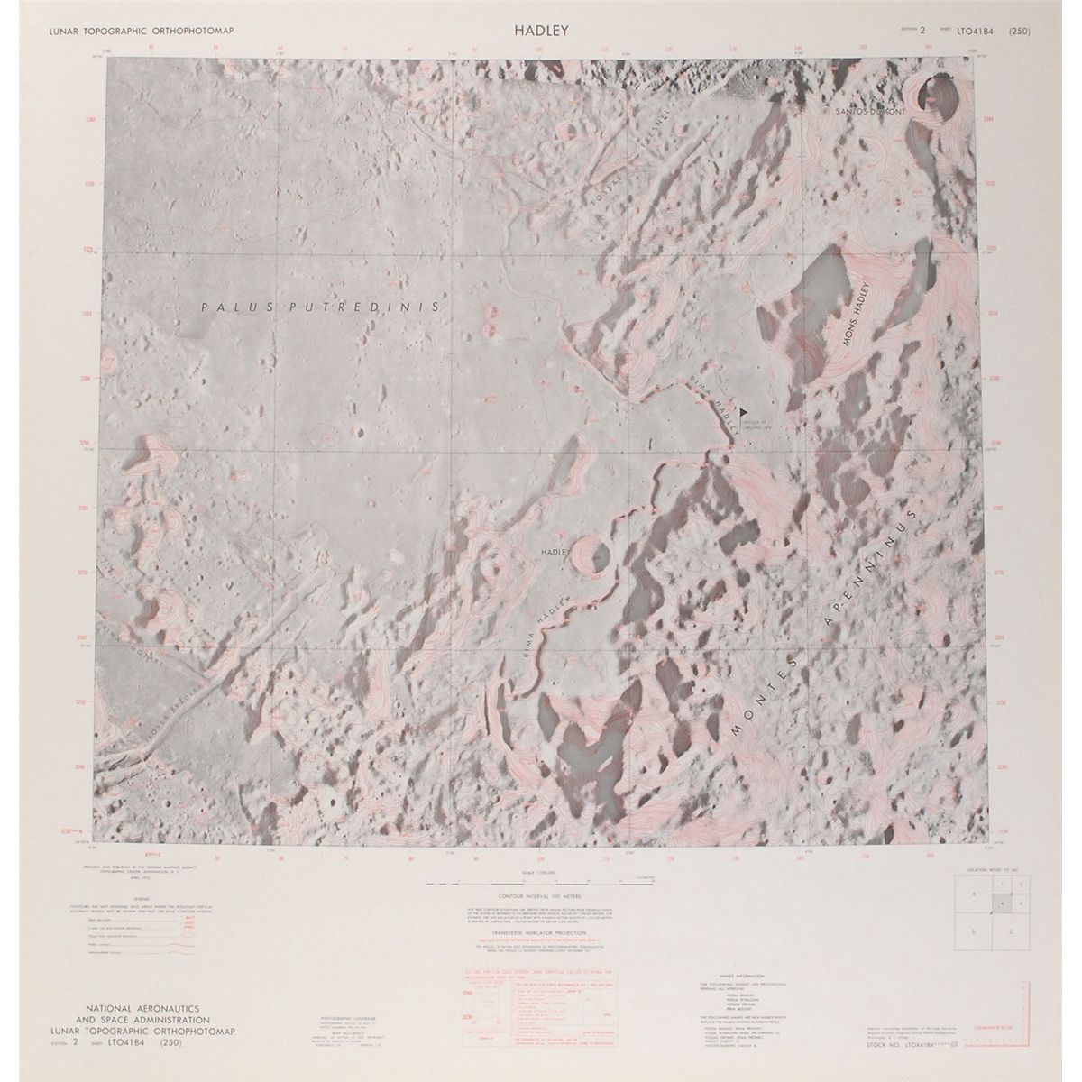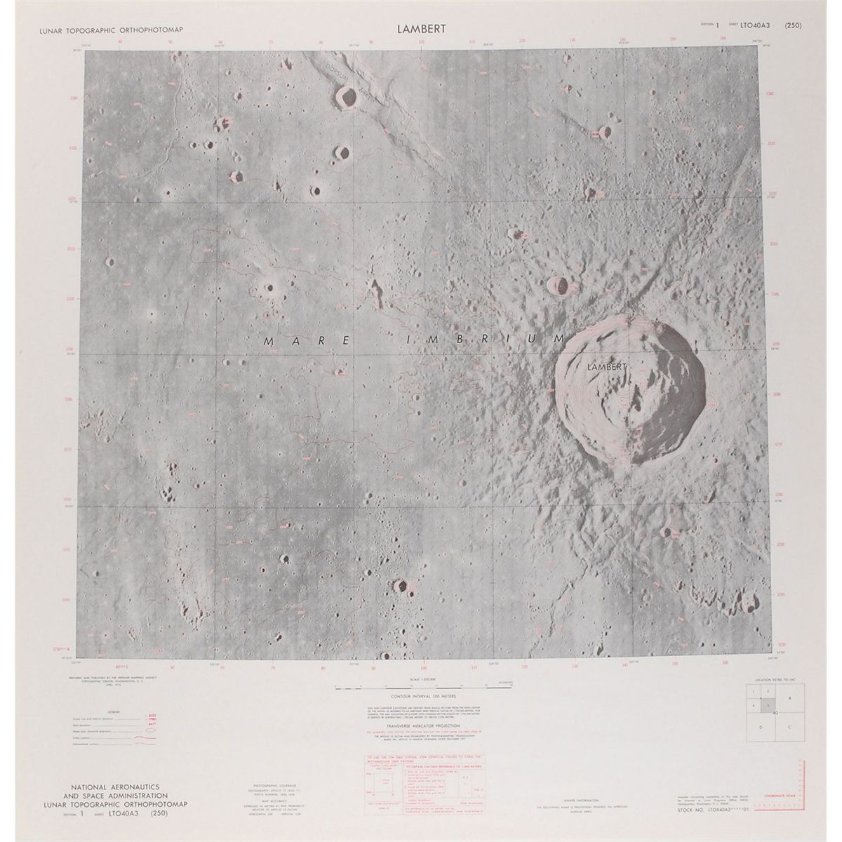 Collection of four original charts from the Lunar Topographic Orthophotomap Series, including one of the Apollo 15 landing area. All four measure 25.5? x 26.5? and are 1:250,000 in scale. Charts are titled “Hadley,” “Smithson,” “Lambert,” and “Neujmin.” Rolled and in fine condition, with scattered edge creases.