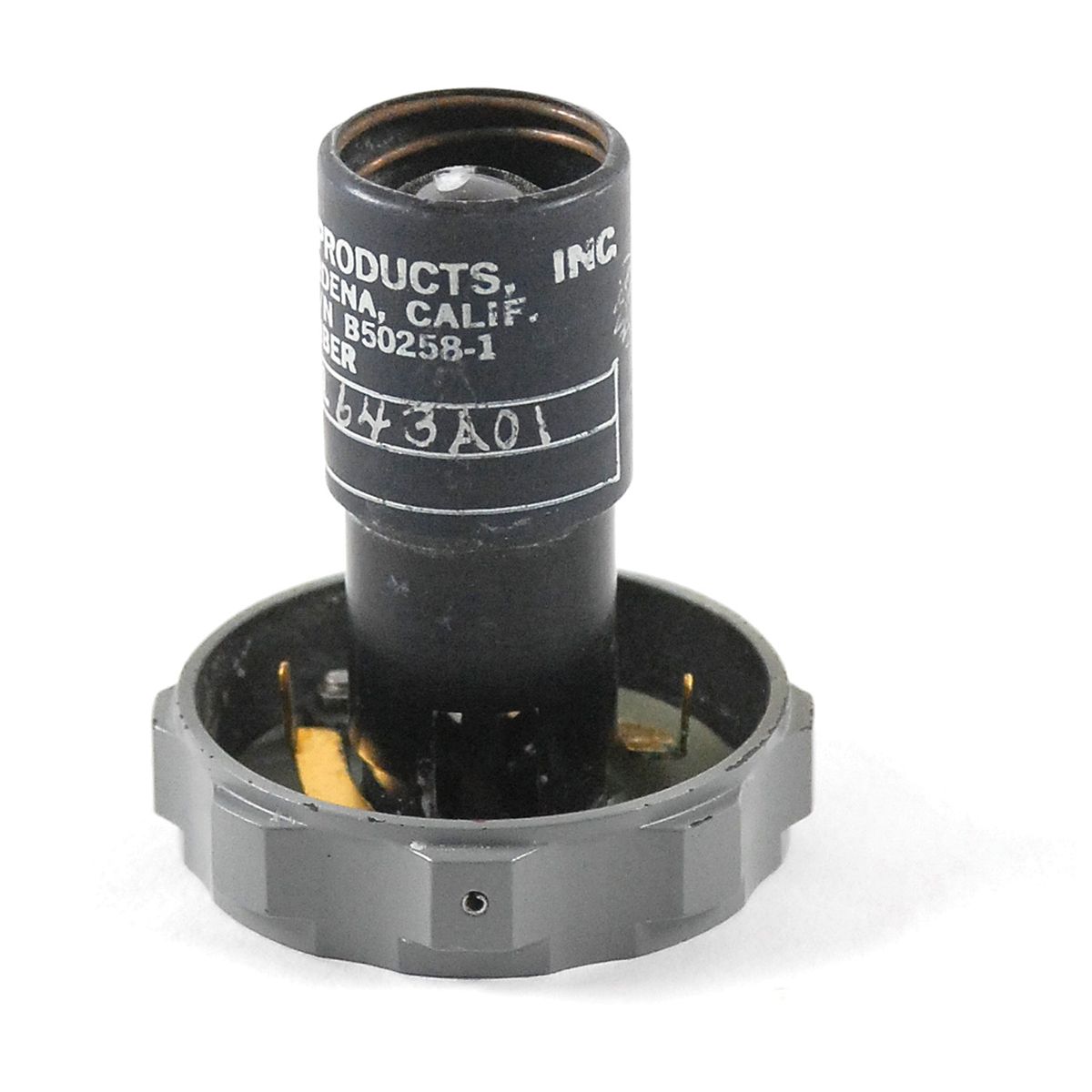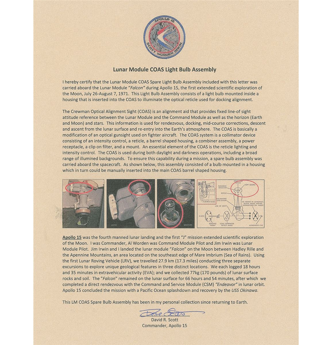 Flown COAS Spare Light Bulb Assembly carried to the lunar surface on board the Apollo 15 Lunar Module Falcon. Assembly measures 2 x 1.75. Assembly consists of a small light bulb inside a housing which would be inserted into the COAS to illuminate the optical reticle used for docking alignment. In fine condition. Accompanied by a letter of authenticity from Dave Scott, complete with images and diagrams of the assembly, which reads, in part: “I hereby certify that the Lunar Module COAS Spare Light Bulb Assembly included with this letter was carried aboard the Lunar Module ‘Falcon’ during Apollo 15…The Crewman Optical Alignment Sight (COAS) is an alignment aid that provides fixed line-of-sight attitude reference between the Lunar Module and the Command Module as well as the horizon (Earth and Moon) and stars…To ensure this capability during a mission, a spare bulb assembly was carried aboard the spacecraft…This LM COAS Spare Bulb Assembly has been in my personal collection since returning to Earth.”
