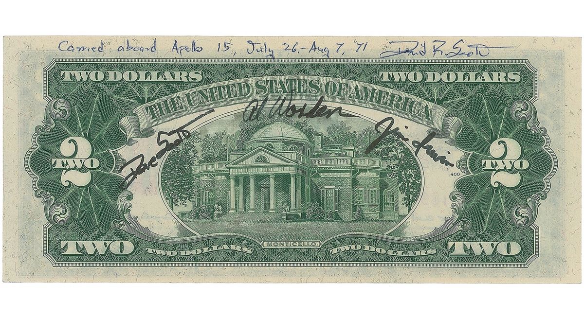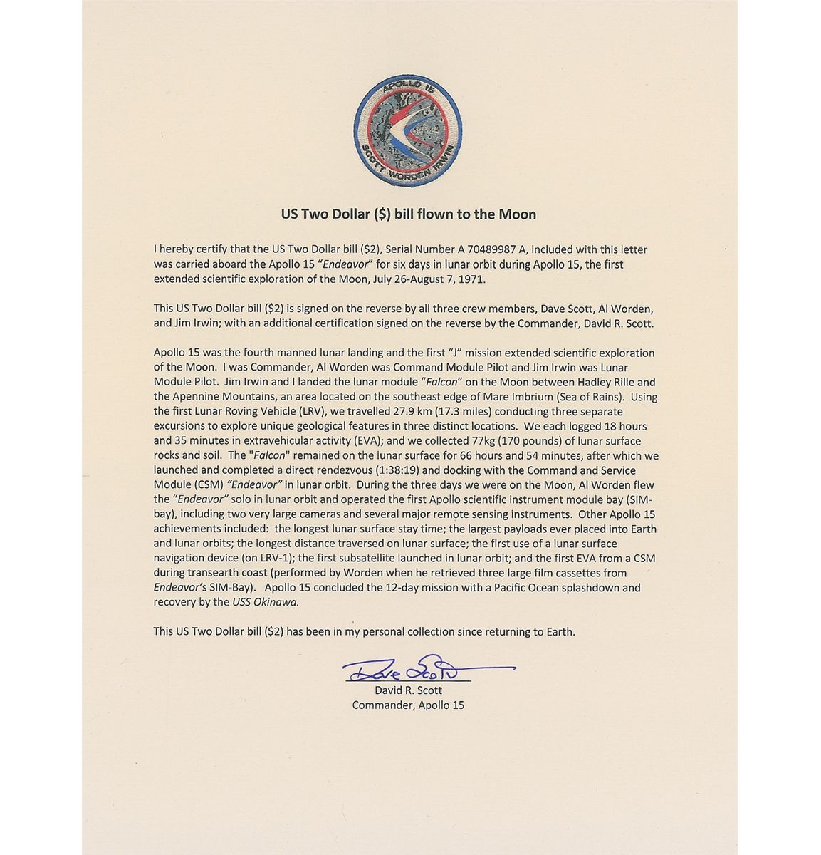 Flown Series 1953B two dollar bill, serial number A70489987A, signed across the top of the reverse in blue ballpoint, “Carried aboard Apollo 15, July 26–Aug 7, ’71, David R. Scott,” and also signed in black felt tip by the crew, “Dave Scott,” “Al Worden,” and “Jim Irwin.” Accompanied by a certificate of authenticity from Dave Scott, which reads, in part: “I hereby certify that the US Two Dollar Bill ($2), Serial number A 70489987 A, included with this letter was carried aboard the Apollo 15 ‘Endeavour’ for six days in lunar orbit during Apollo 15…This US Two Dollar Bill…is signed on the reverse by all three crew members…and an additional certification signed on the reverse by the Commander, David R. Scott…This US Two Dollar bill…has been in my personal collection since returning to Earth.” In very fine condition. Carried as a good luck symbol on many space flights, a total of 50 two-dollar bills were flown to lunar orbit on this mission. Another package of currency was taken to the lunar surface, but accidentally left behind.