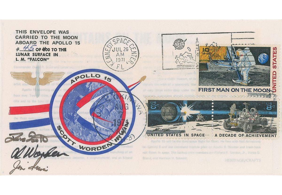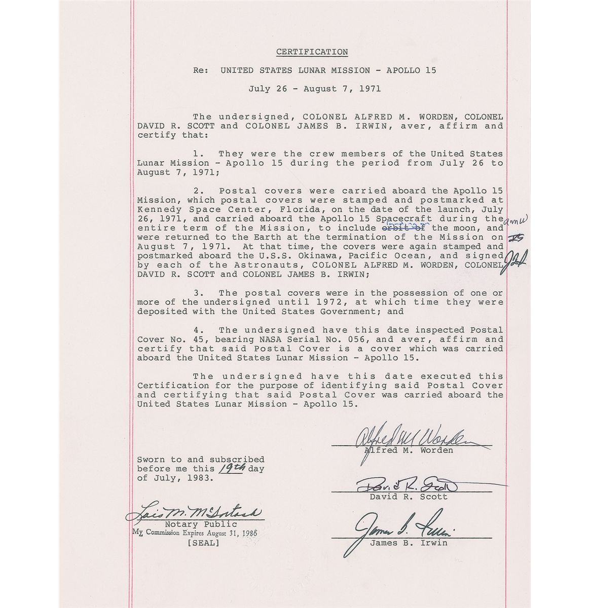 Uncommon Apollo 15 postal cover, 6.5 x 3.75, numbered 45 of 400, carried to the lunar surface aboard the Falcon, signed in the lower left corner by crew members Dave Scott, Al Worden, and Jim Irwin. In fine condition. This particular cover comes from astronaut Dave Scott’s personal collection, and retains its original informational card insert. Accompanied by a one-page typed notarized certification, signed “Alfred M. Worden,” “David R. Scott,” and “James B. Irwin.” The provenance reads in part: “Postal covers were carried aboard the Apollo 15 Mission, which postal covers were stamped and postmarked at Kennedy Space Center, Florida, on the date of the launch, July 26, 1971, and carried aboard the Apollo 15 Spacecraft during the entire term of the Mission, to include landing on the moon and were returned to the Earth at the termination of the Mission on August 7, 1971…The postal covers were in the possession of one or more of the undersigned until 1972, at which time they were deposited with the United States Government…The undersigned have this date inspected Postal Cover No. 45, bearing NASA Serial No. 056, and aver, affirm and certify that said Postal Cover is a cover which was carried aboard the United States Lunar Mission—Apollo 15.” All three crew members have also added their initials to a small correction in the text. Also included is a two-page letter of authenticity signed by Dave Scott, which reads, in part: “I hereby certify that the postal cover No. 45 included with this letter was carried to the lunar surface aboard the Lunar Module Falcon.” Scott goes on to recall the history of these covers and their eventual return to the Apollo 15 crew. In fine condition.